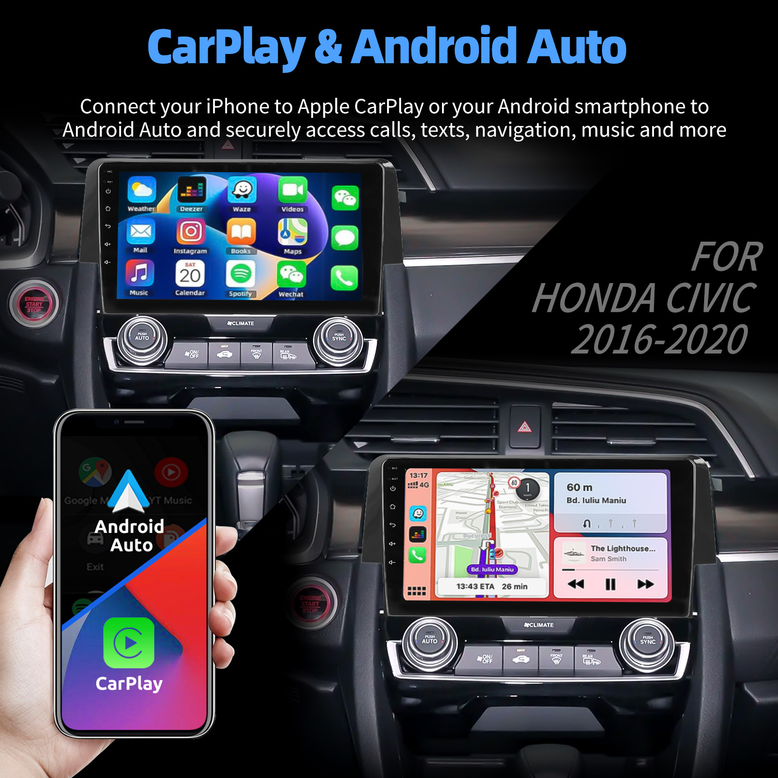 9 Inch Android 15 Car Radio For Honda Civic 2016-2020: The Android car radio with 9" 1280* 720 IPS capacitive touchscreen, 4GB RAM and 64GB ROM allows you to download your favorite apps and videos, so driving is no longer boring. No extra frame, no cable change, plug and play. It comes with Canbus and supports most original functions: Steering wheel control, reverse signals and reading original computer data, etc.