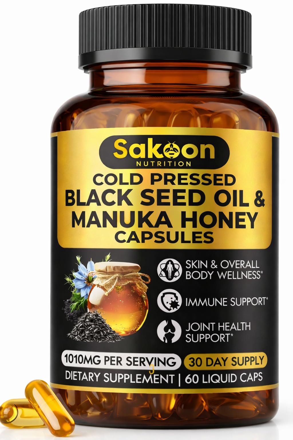 Black Seed Oil Capsules - With New Zealand Manuka Honey, 60 Count (Pack of 1)