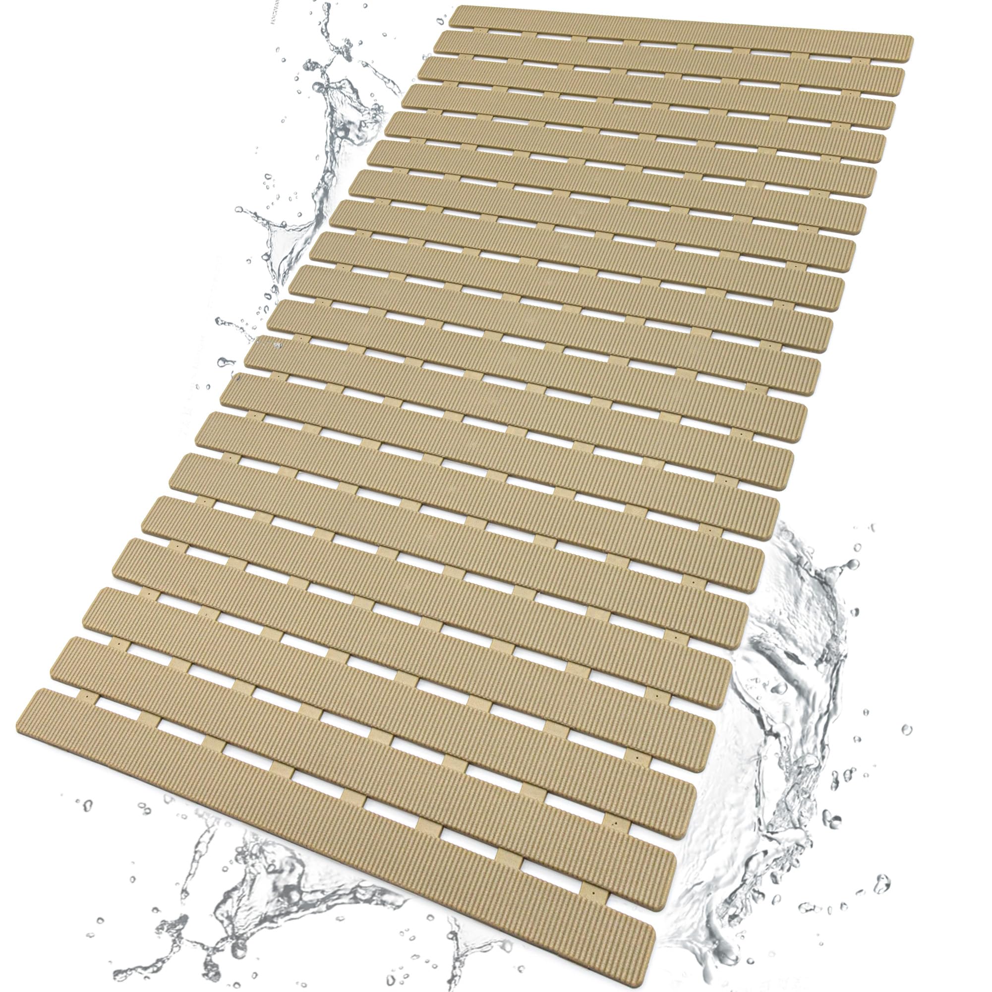 SUPER NON-SLIP:There are over 160 suction cups at the bottom that cling very well and keep the mat in place at all times without slipping.Slotted panels and textured surface design also has a good anti-skid performance, providing a safe, comfortable footing for protection against falls, even if it touches the shower get it will not slip.