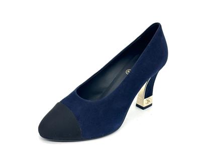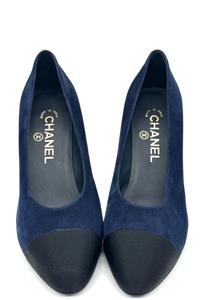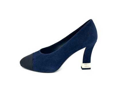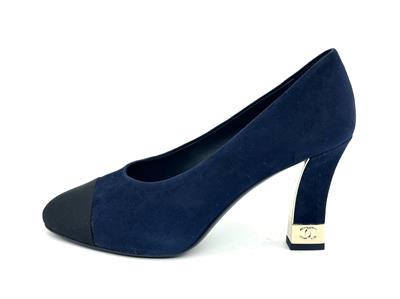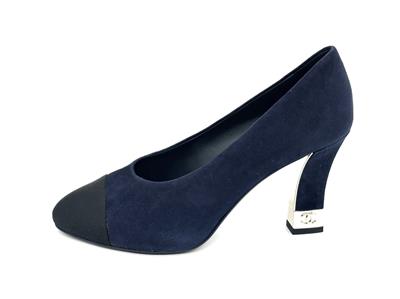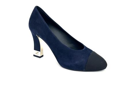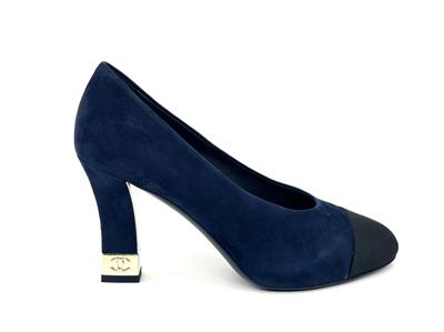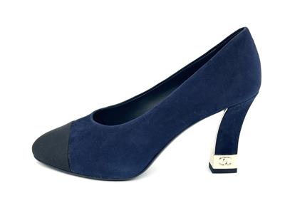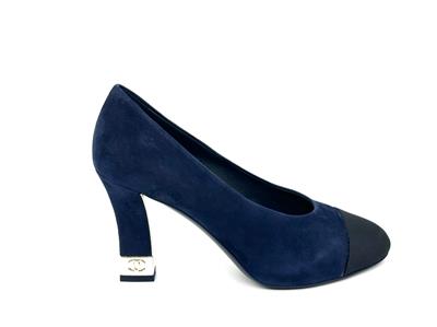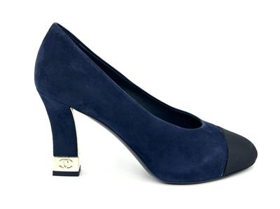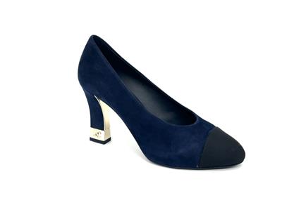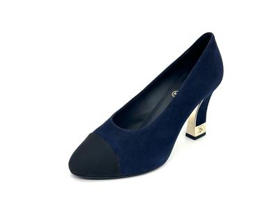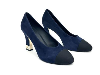 These navy blue suede pumps feature a pointed black grosgrain cap toe. Suede square 3.5" heel with goldtone metal CC embossed detail. Padded leather insole and leather sole. Made in Italy. Designer color: Navy Blue/Black.