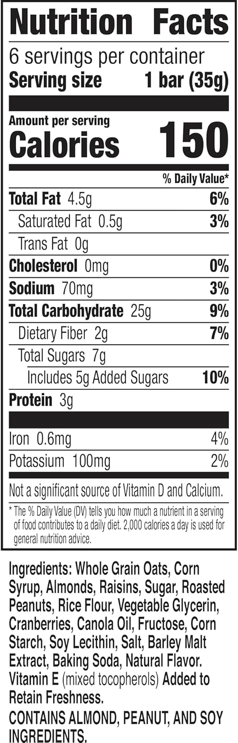 MADE WITH REAL FRUIT: A delicous binat of savory almonds,,succulent raisins and dried cranberries,plus whole grain oats