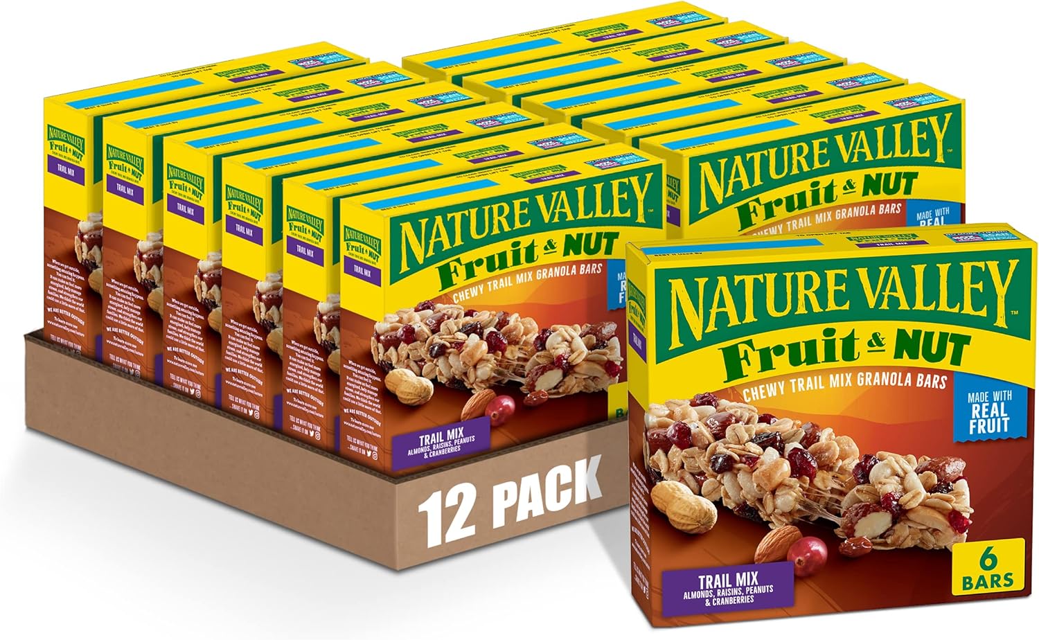 CONTAINS: Twee regular cardboard boxes of Valley Fruit and Nut Granola Chewy Bars,Trail Mix,6 Bars,7.4 oz; for instant snaing.