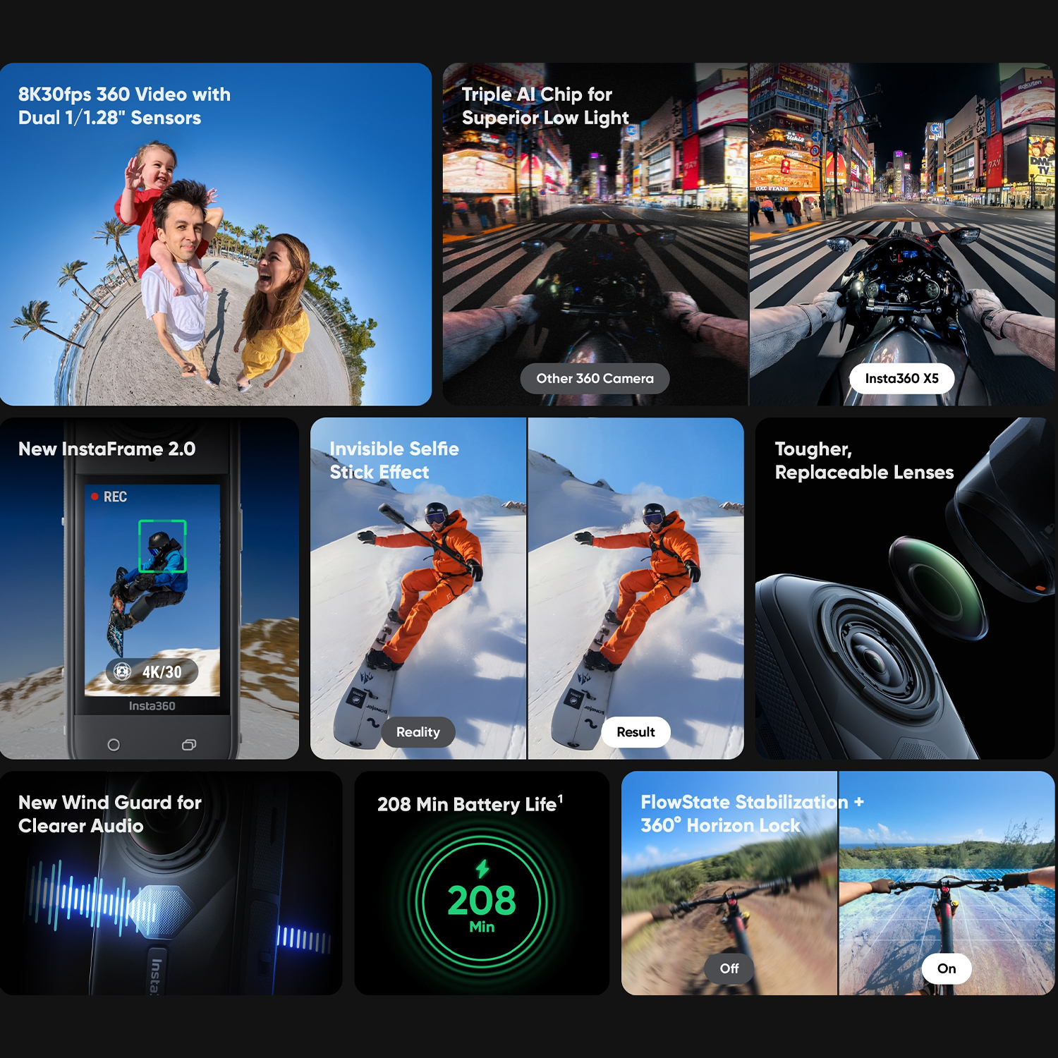 With 78% more pixels than 5.7K cameras, the X5’s ultrasharp 8K resolution ensures that reframed video matches standard camera footage for seamless edits. PureVideo AI enhances every shot with advanced noise reduction and dynamic range optimization, producing clear, vivid footage in any lighting condition. Supersampling from 11K to 8K captures the finest details, while Active HDR at 60 fps preserves stunning highlights and shadows, even in fast-paced action.