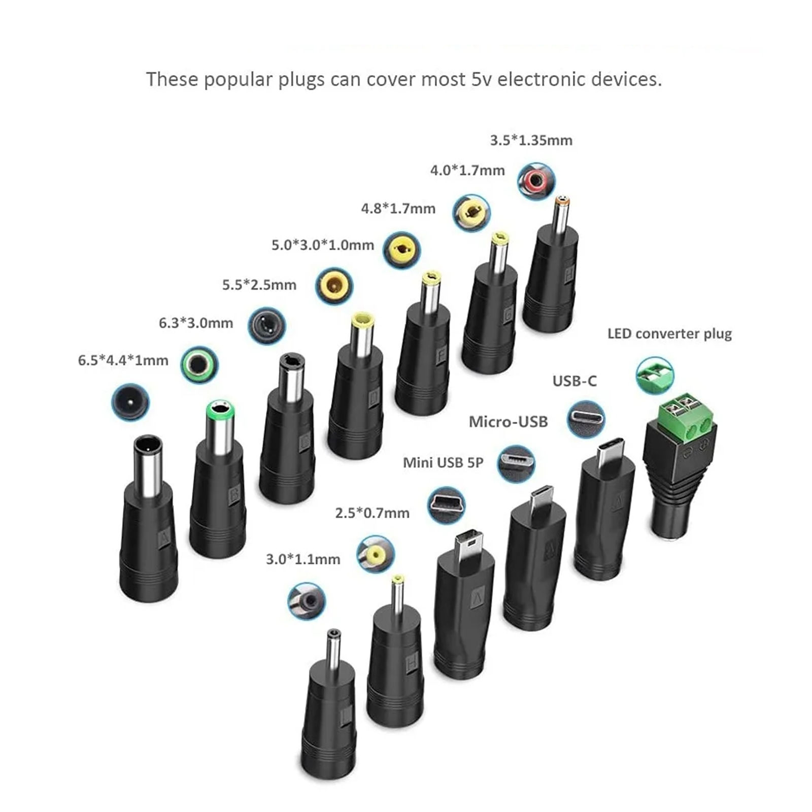 13 adapter plugs: 5.5x2.5mm, 2.5x0.7mm, 3.0x1.1mm, 3.5x1.35mm, 4.0x1.7mm, 4.8x1.7mm, 6.3*3.0m, 5.5x3.0mm, 6.5x4.4mm, LED terminal plug, Micro USB, Type-C, Mini USB.