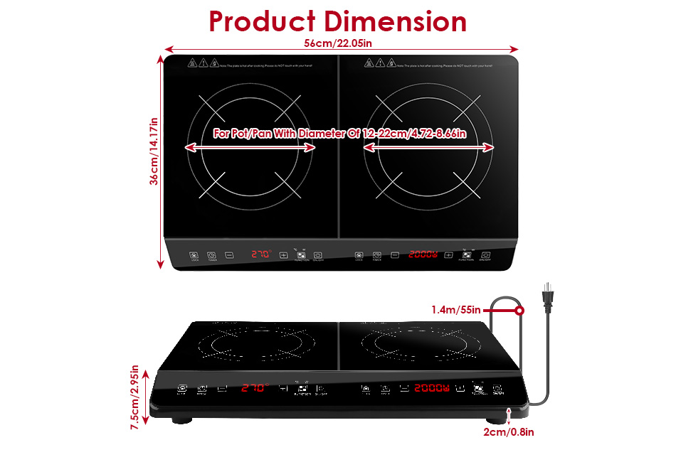 - Recommended Pot/Pan Diameter: 12cm-22cm/4.72in-8.66in