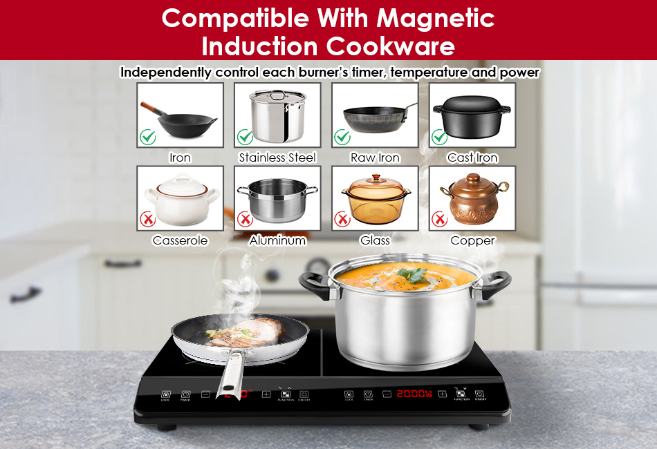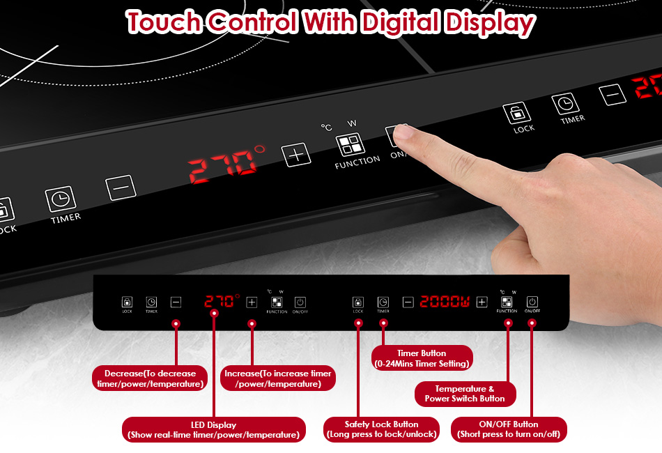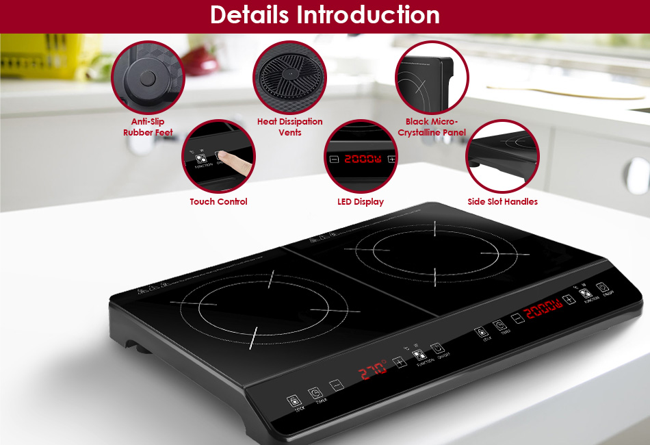 4000W Electric Dual Burner Product Detail Image Gallery Product DescriptionOverview:Our Induction Cooker featuring with two independent 2000W burners controlled by separate touch buttons, allows you to cook two kinds of food simultaneously or just use one stove individually according to your demands. It offers 9 levels of firepower (200W to 2000W) and 9 temperature settings (176℉ to 518℉), perfect for simmering, frying, boiling, baking, steaming, and slow cooking a variety of delicious meals. With its smart timer setting (0-3H), you can enjoy cooking without constantly monitoring. Designed with a safety lock for safer cooking and smooth surface for easy cleaning. Compatible with various cookware and serves as a reliable kitchen assistant. Upgrade your kitchen experience with our electric induction cooktop today! Features:- Dual Zone Induction Cooktop:Designed with dual burners controlled by separate touch button,each 2000W power,total 4000W powerful firepower heats up food quickly and evenly. Support cooking simultaneously or individually according to your personal needs,more convenient and energy-saving. Extra display makes you easy to view the setting timer/power/temperature.