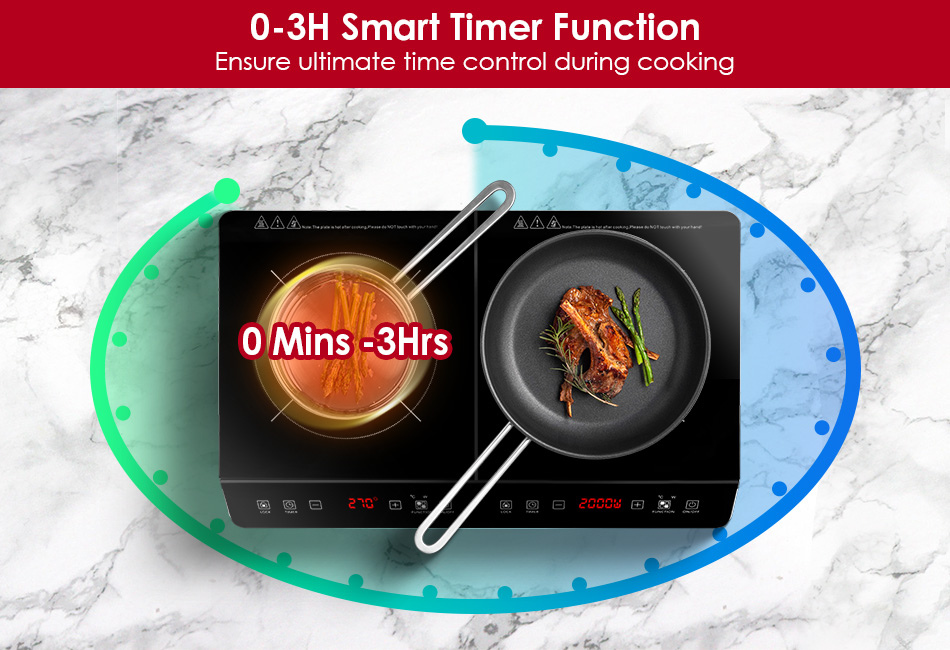 - Smart Timer Setting:Adopt smart timer setting between 0-3H(1Mins Interval),you can adjust the cooking time more perfectly and accurately. No need to always keep your eye on the countertop,the burner will automatically shut down after setting time is up. Allow you to enjoy the rare leisure time even when cooking.