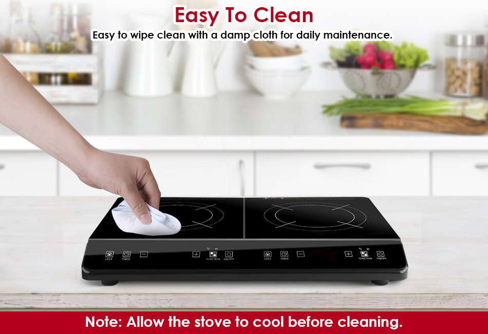 - Safety Lock & Easy Cleaning:Safety lock ensures safe using and prevents accidental start-up. Long press the “LOCK” button to lock/unlock the control panel. Smooth surface makes it easy to wipe clean with a damp cloth for daily maintenance. Please be attention:Allow the stove to cool before cleaning. Besides,overheat protection makes it auto shut off when the temp is over 270℃/518℉.