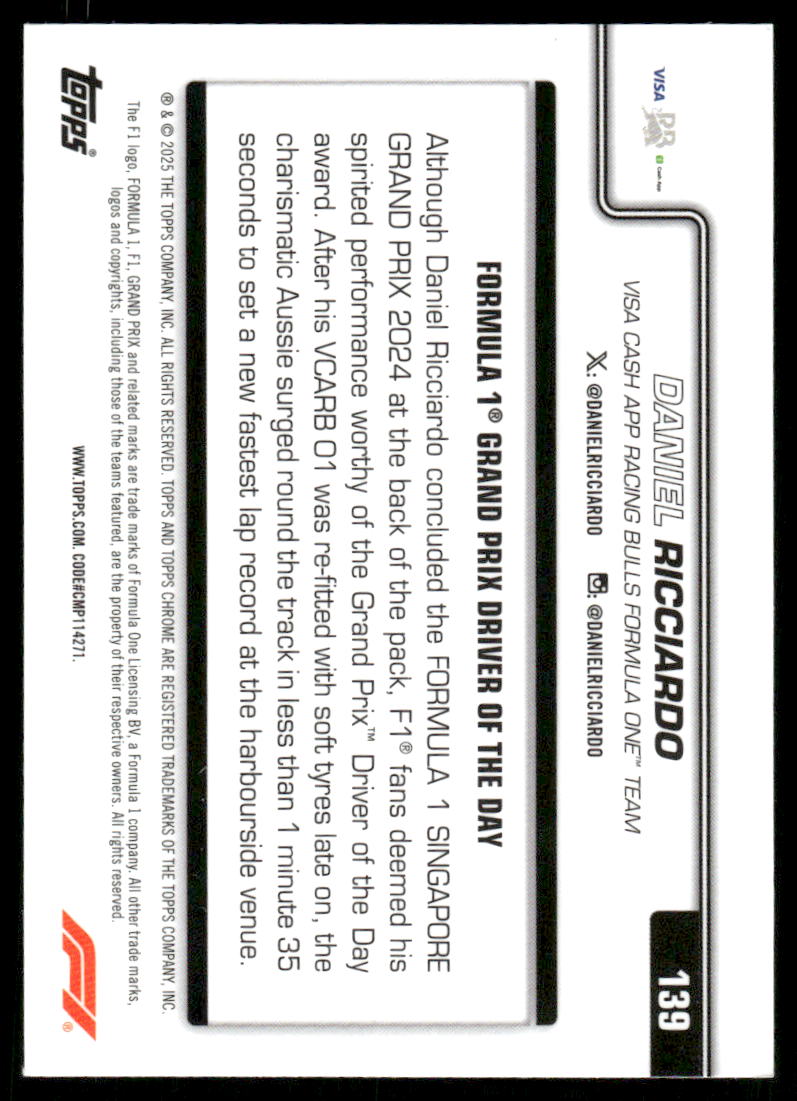 2025 Topps Chrome Formula 1 Black and White Lazer Ref 139 Daniel Ricciardo DOD