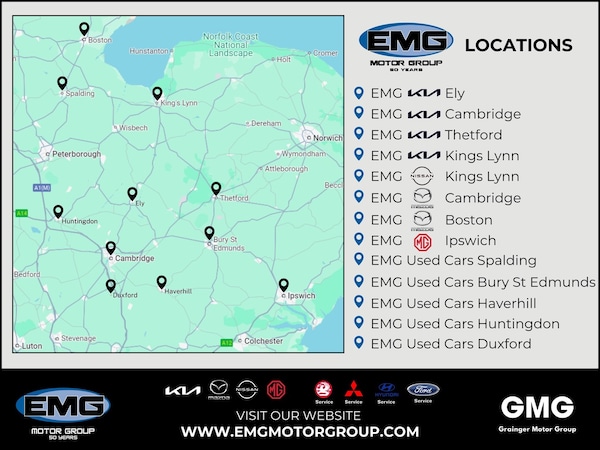Welcome to EMG Motor Group, an established automotive retailer in East Anglia and the East Midlands. We’re proud to offer the full range of new cars from Kia, Mazda, Nissan and Mitsubishi, as well as specialist aftersales care for Ford, Hyundai and Citroën. With showrooms across the East of England, we are well-placed to help customers find their perfect new or used car. Whether you’re looking for a compact city runaround, a family-sized SUV or an electric/hybrid vehicle, you’ll discover the ideal motoring solution with us. And, with our range of special offers and tailored finance packages, you’ll have no trouble finding a model to suit your budget