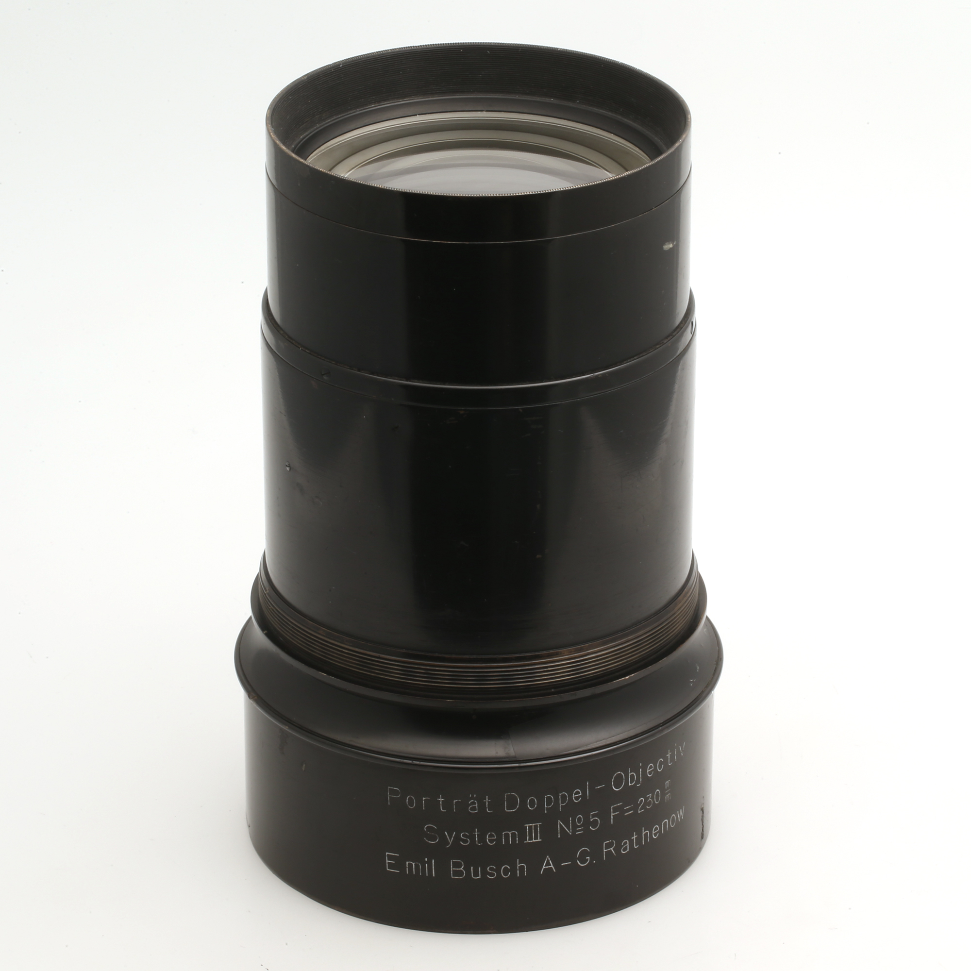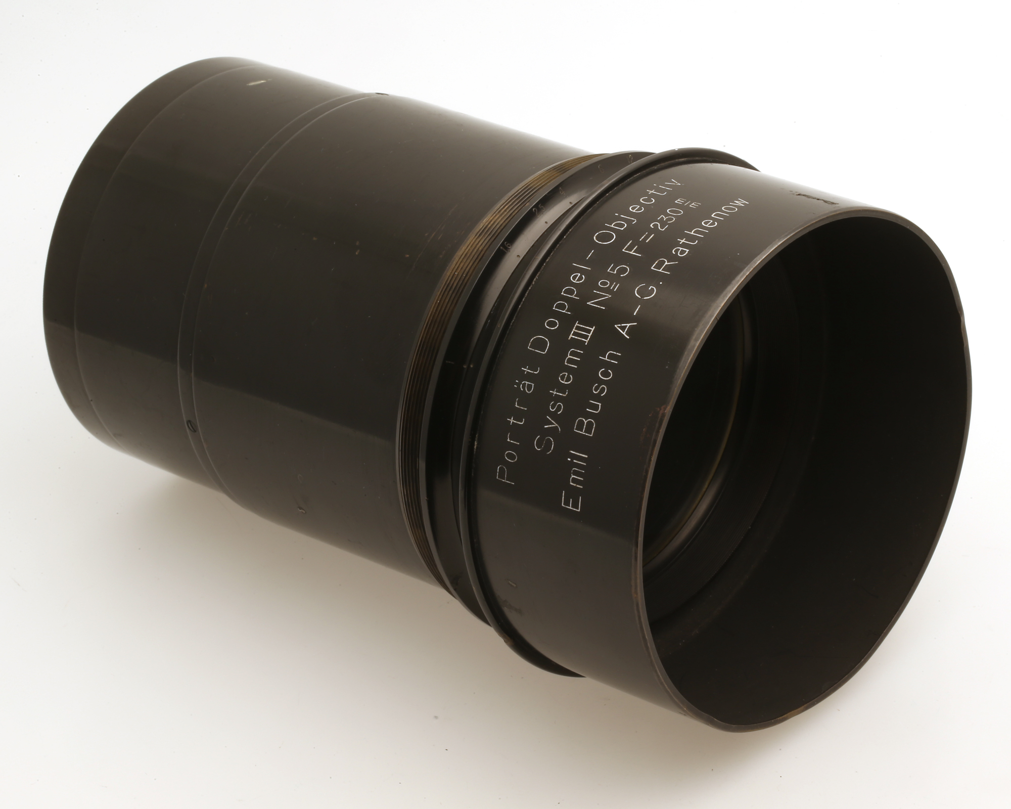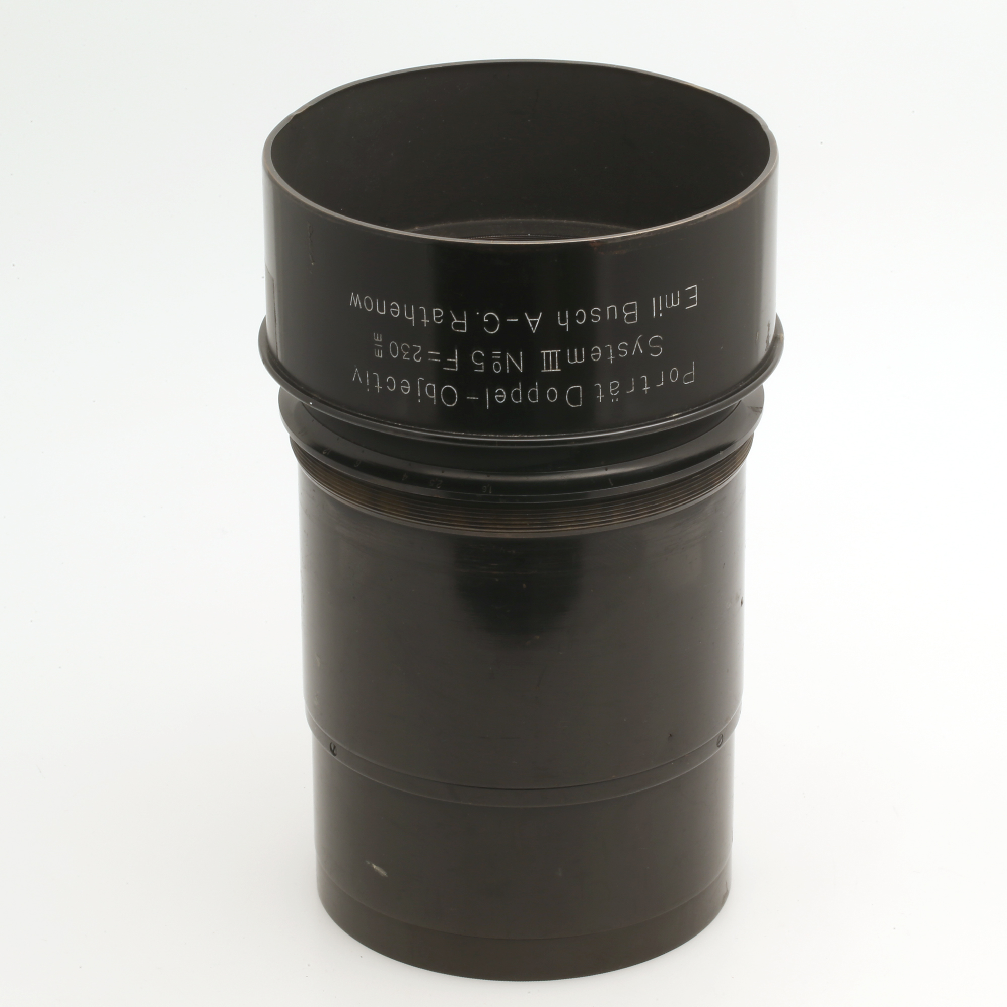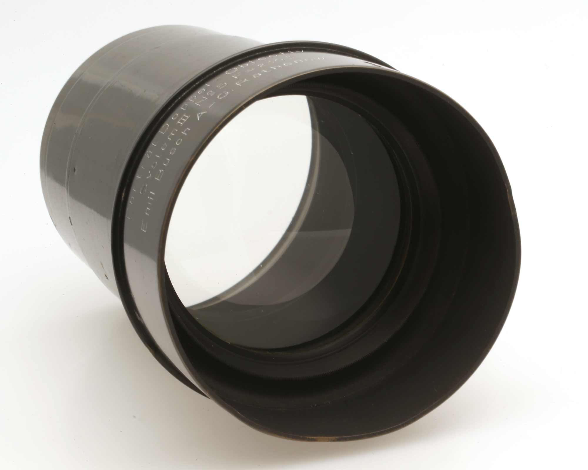 Großformat-Objektiv mit Sonnenblende und ungewöhnlicher Blendenmechanik.