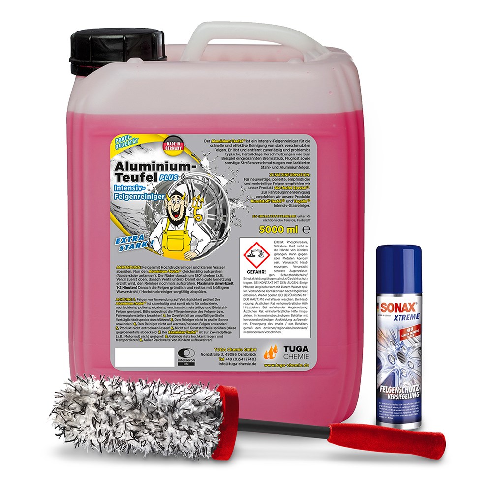 TUGA CHEMIE 5 L Aluminium-Teufel® Felgenreiniger + SONAX Microfaser FelgenBürste + SONAX 250 ml XTREME FelgenSchutzVersiegelung