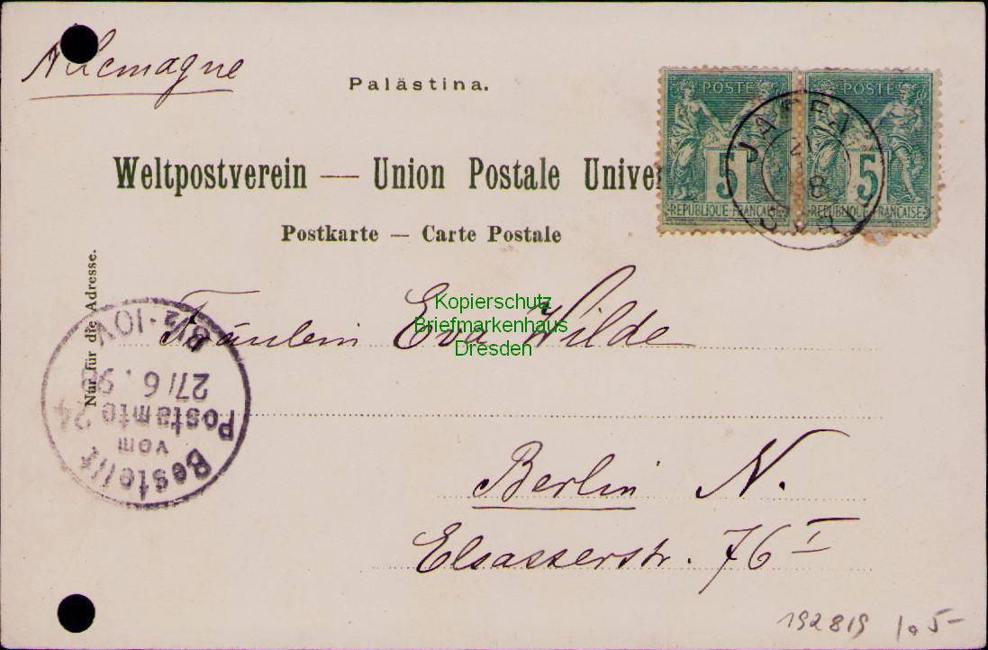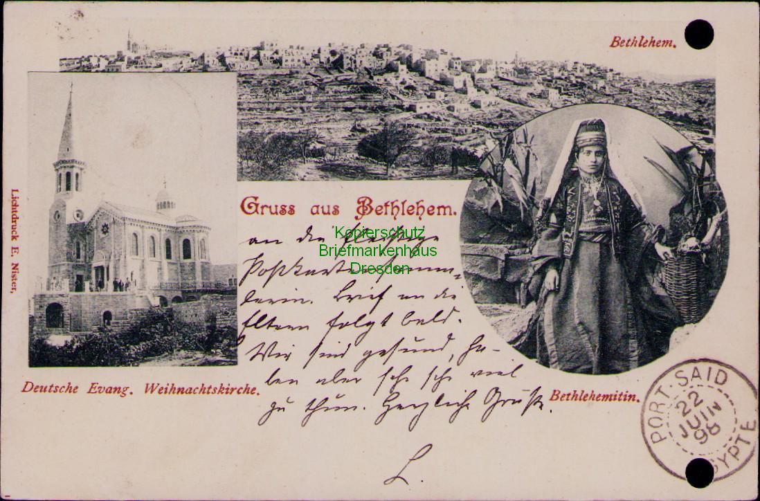 192819 AK Gruss aus Bethlehem 1898 Deutsche Evang. Weihnachtskirche Jaffa französische Post über Port Said Egypte nach Berlin