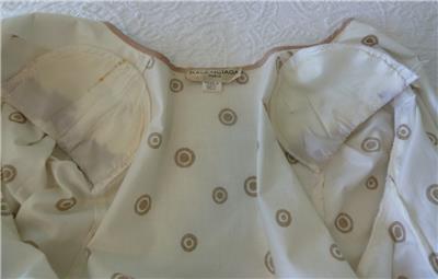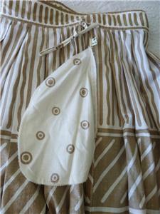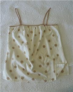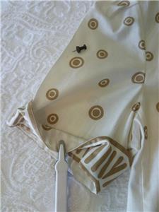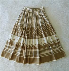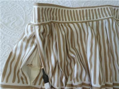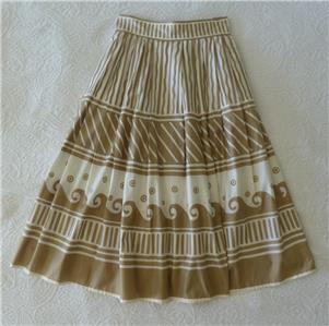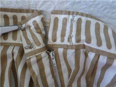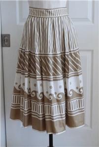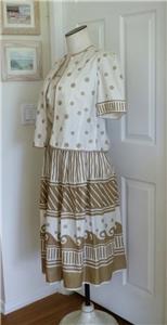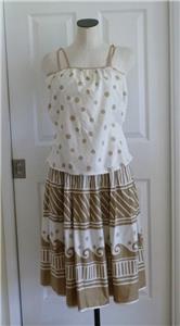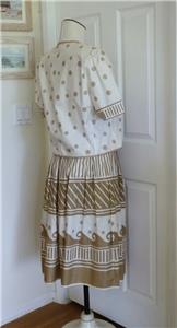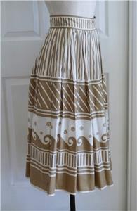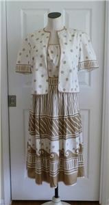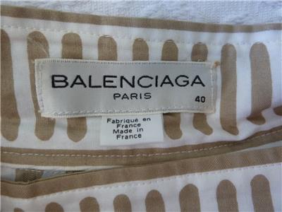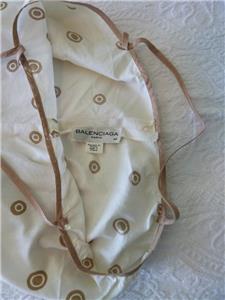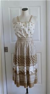 Very rare vintage 80s three-piece set from BALENCIAGA PARIS, made in France, just as stylish today. Tag size 40, please check measurements provided below, paying special attention to the skirt waist (could be enlarged just a bit) and the cami top, which was pinned to the mannequin, as it would not go over the broad shoulders. Lightweight 100% cotton, ivory-white and golden-brown, in a mix of stripes, double dots, and waves. Pieces included as follows: