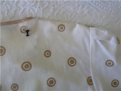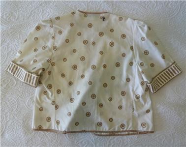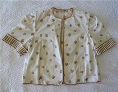 Open jacket, cuffed short sleeves pleated at the shoulders. There are satin shoulder pad shells but the pads themselves have deteriorated. Can easily be snipped out or refilled as desired. Shown in photo 17.