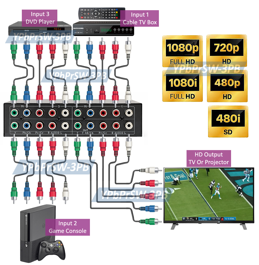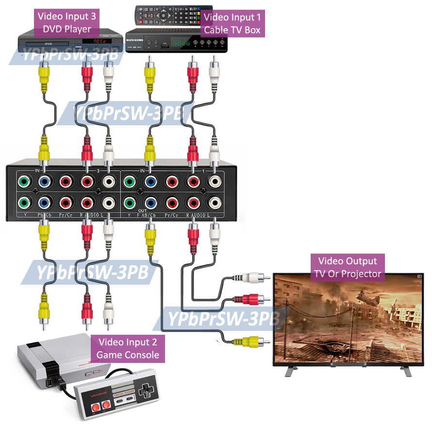 This 3-Way Component Video (YPbPr) Switcher allows you to connect up to 3 component video devices to a single TV, monitor, projector with component video and stereo audio inputs.
