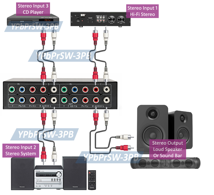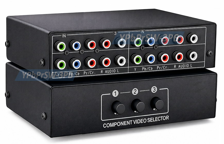 This component video audio switch can be used as a regular 3 in 1 out composite RCA video switcher or a stand alone stereo audio switcher.