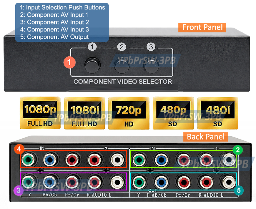 This A/V switcher supports all component RGB video resolutions from 480i/480p, 576i/576p, 720p and up to 1080i/1080p. It is also a great way to expand your existing TV display with more