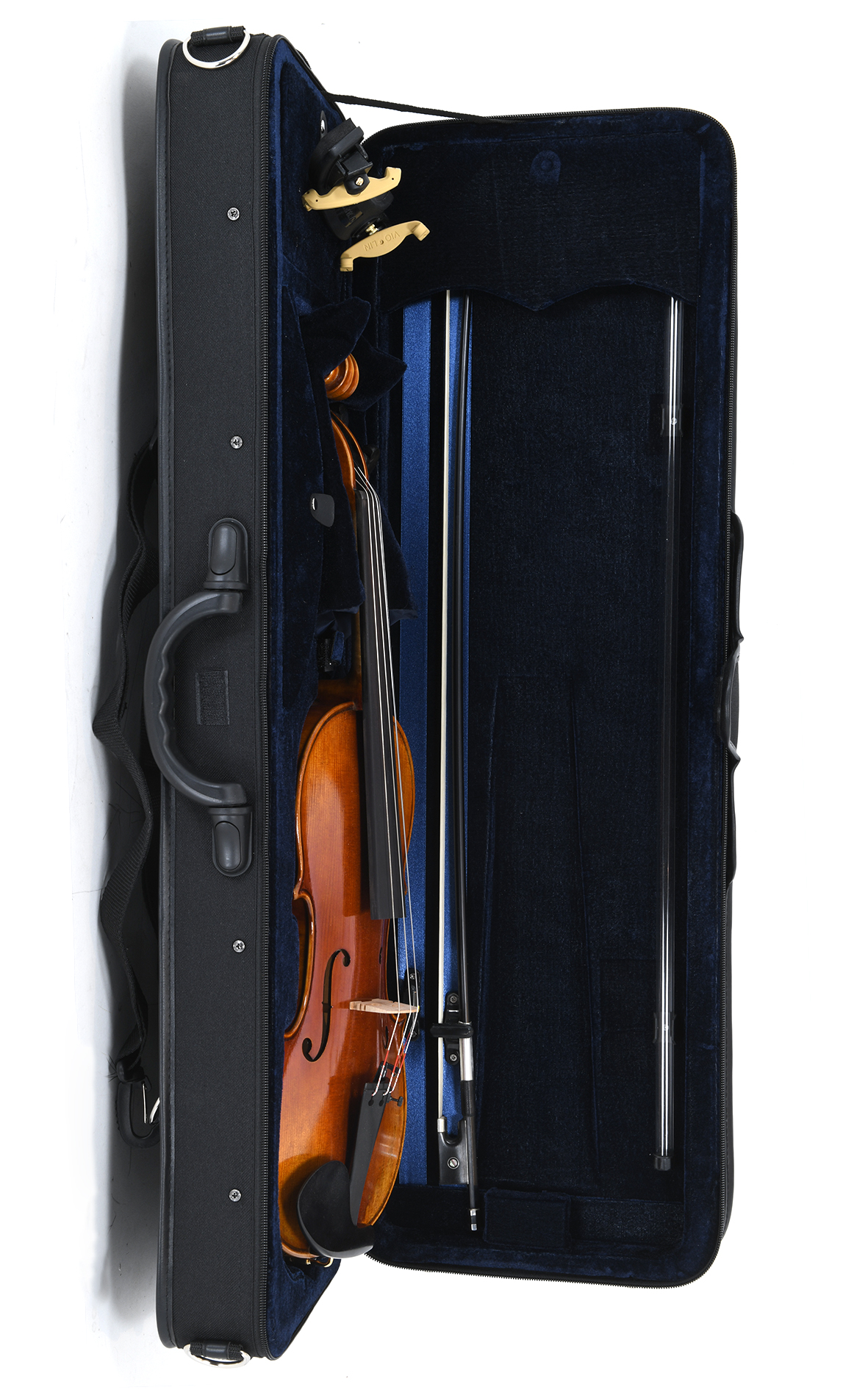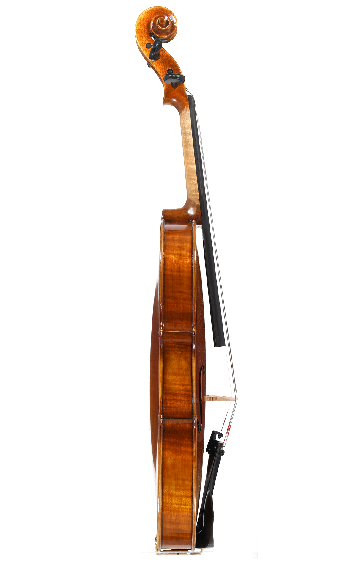 CV Selectio “Opus 10”, contemporary workshop violin after Stradivari model. Modern full-size instrument designed for versatile performance use. Made from quality spruce and flamed maple with a luminous golden-brown varnish. Clear, bright and balanced tone with rich resonance and strong projection.