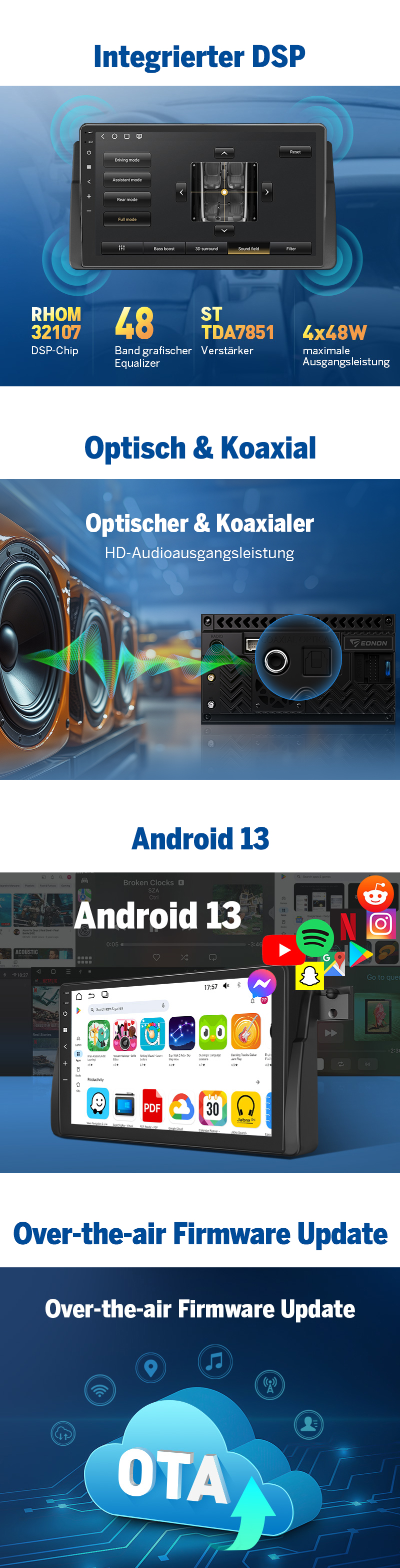 | Sound | DSP + TDA7851, 48-Band EQ, Subwoofer | einfacher Chip, eingeschränkter Klang |