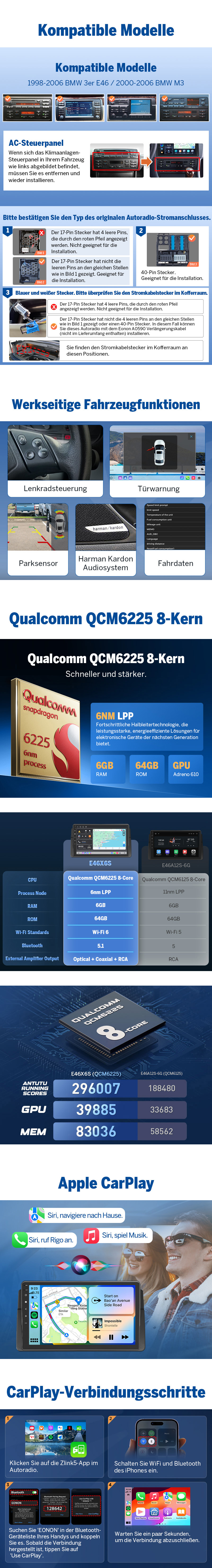 E46X6S = Factory-Kompatibilität + 6GB RAM, 64GB Speicher + QLED + DSP + CarPlay/Android Auto + 4G LTE + OTA Updates