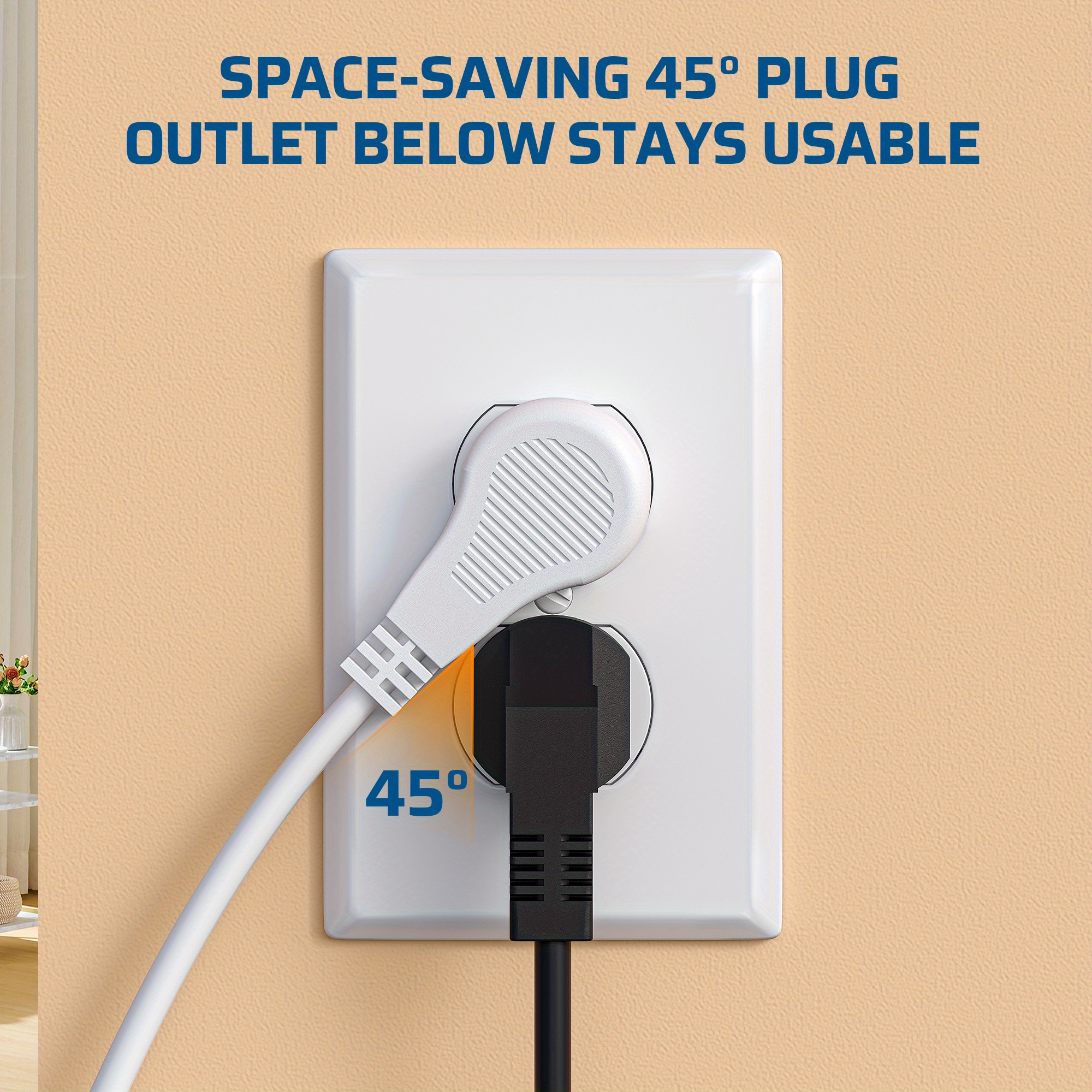 Angled Flat Plug: Features a 45° flat plug that fits neatly into wall outlets without blocking adjacent sockets, maximizing space for multiple devices