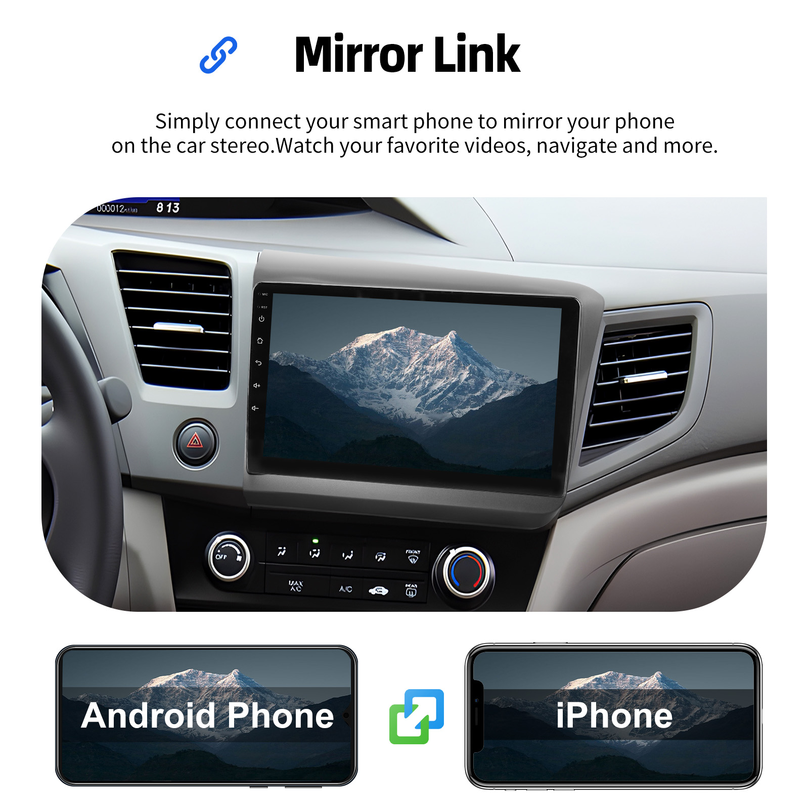 MIRROR LINK & APPLE CARPLAY & ANDROID AUTO: With this car radio, you can experience the amazing Mirror Link function, compatible with iOS and Android phones. You can mirror your smartphone screen to the car radio using apps like Google Maps, Spotify, Youtube, etc. Replace your cell phone with the car screen and turn your vehicle into a smart platform. Immerse yourself in a seamless and user-friendly infotainment experience with Apple CarPlay & Android Auto. Connect your iPhone to Apple CarPlay or your Android smartphone to Android Auto and securely access calls, texts, navigation, music and more. With intuitive operation via the touchscreen or voice control, you have all functions at your fingertips while you remain safely at the wheel. Use your favorite apps and stay connected at all times while keeping your eyes on the road. Turn your vehicle into an extended hub for your mobile devices and experience a new dimension in infotainment.