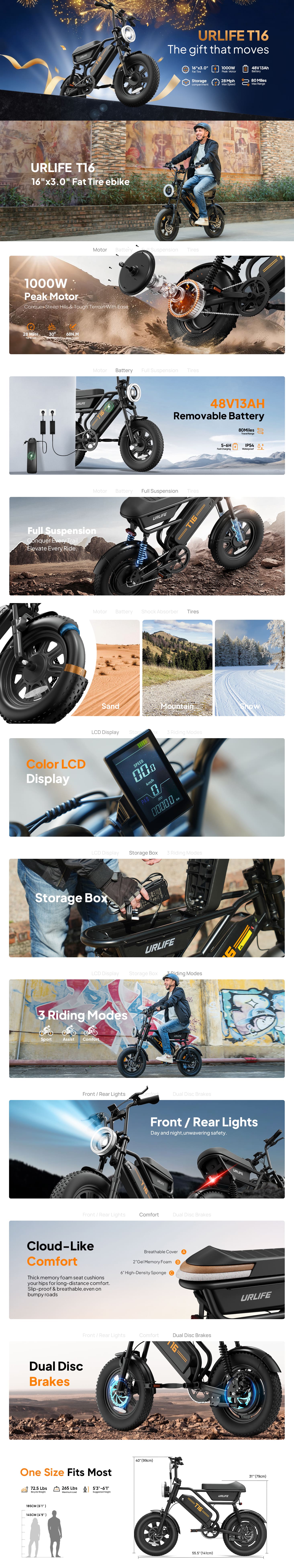 Dominate steep inclines and rugged trails with a 1000W peak power motor that easily tackles 30° slopes. Paired with 16" x 3.0" wide tires, this eBike delivers exceptional grip on sand, snow, mountains, and dirt — reaching speeds up to 28 MPH.