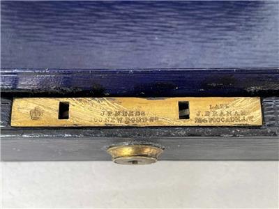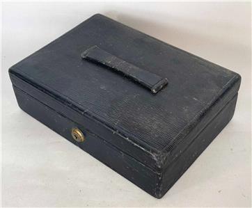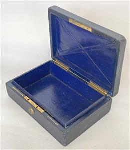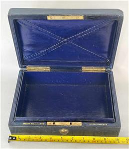 The hinged lid has "stand up" hinges (see photos), and opens to reveal a sumptious, Purple Leather lined interior.