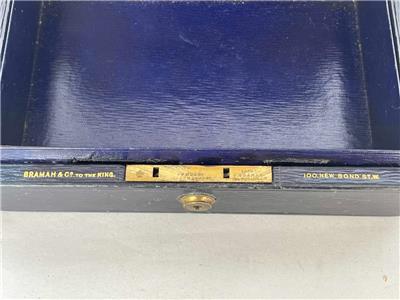 The lock is the Bramah type; but has no key, the strike plate has no "studs" or "pins", (see photos).