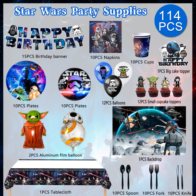 Star Wars Party Supplies,114 pcs Star Wars Party Decorations & Tableware Set-Star Wars Party Plates Napkins Cups & Star Wars Birthday Banner Balloons Cake Decorations etc Star Wars Birthday Decorations
