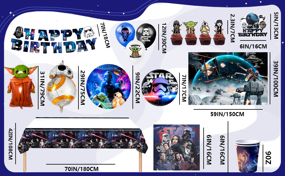 🎉Star Wars Birthday Decorations Set🎉 This star wars party supplies include 1 star wars birthday banner, 1 star wars cake topper, 1 star wars tablecloth, 10 7''star wars party plates, 10 9''star wars birthday plates, 10 star wars birthday napkins, 10 star wars party cups, 12 star wars cupcake toppers, 12 star wars birthday balloons etc star wars party decorations. 🎉Unique Design🎉 Our star wars birthday party decorations and star wars party tableware feature iconic star wars characters, and star wars balloons, star wars cake decorations, and star wars birthday tablecloth are printed with many star wars motifs that can transform your party space into an epic universe. 🎉High-Quality🎉 This star wars birthday party supplies is all made of high-quality materials, and the star wars plates and napkins are made of durable paper, which is sturdy and durable, so you can use these star wars birthday supplies with peace of mind. 🎉Perfect Star Wars Party Decoration Pack🎉 Use these star wars party decoration to embark on a journey of adventure in the milky way! Our star wars party decorations for adults not only can create a festive atmosphere for your star wars birthday party, but also can leave beautiful memories for everyone. 🎉Extensive Use🎉 These star wars tableware and star war birthday decorations are perfect for star wars birthday party, star wars theme party, star wars party, gaming party, classroom party, and more.