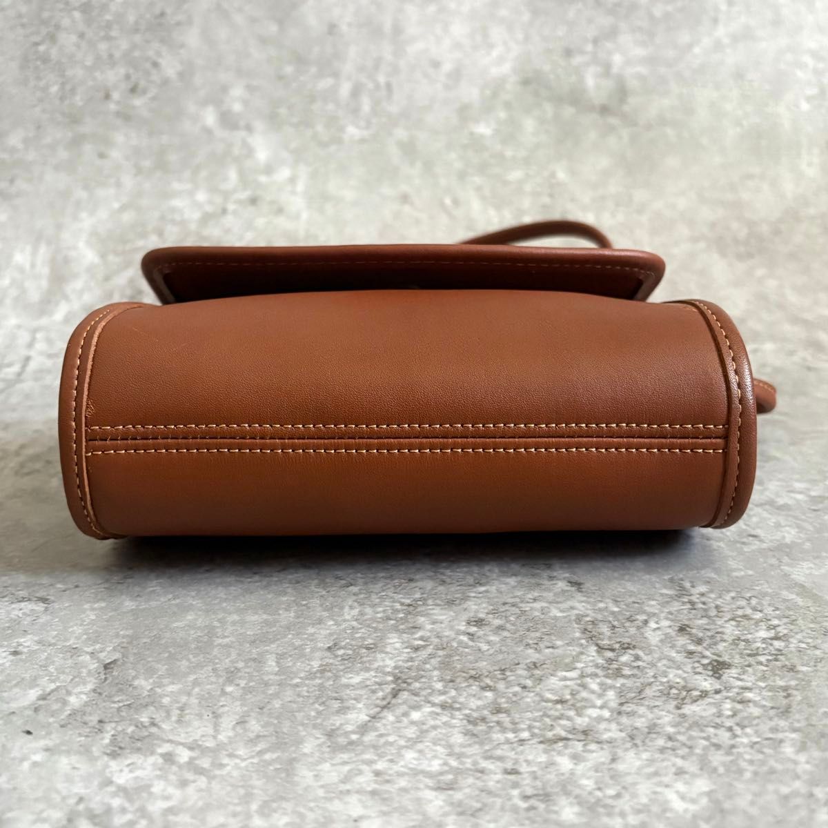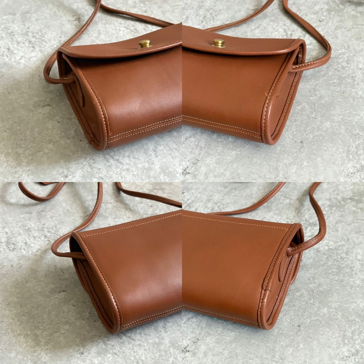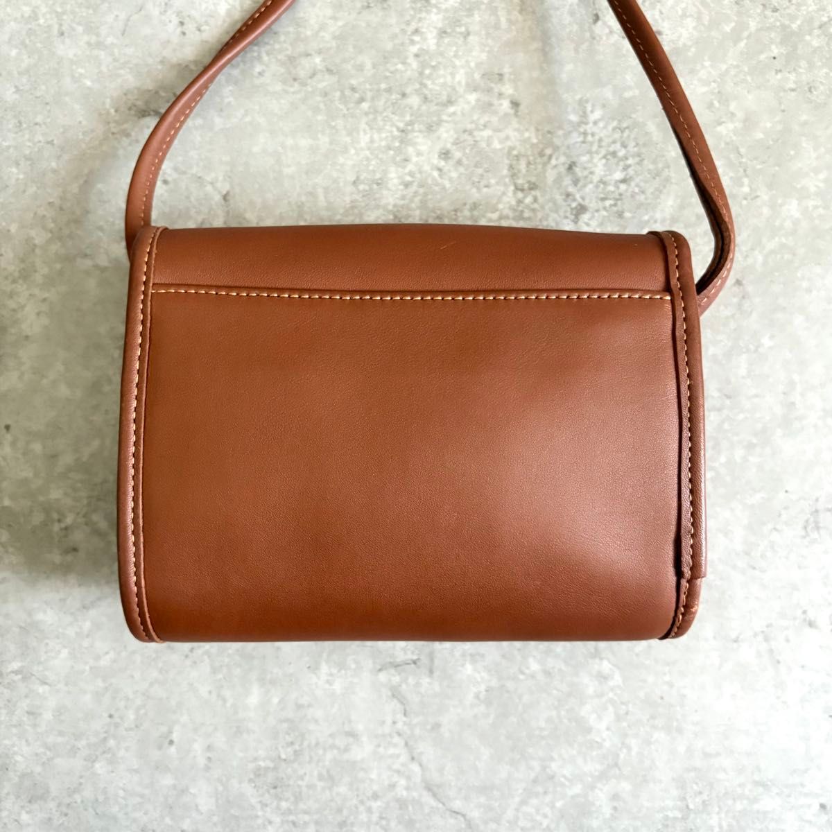 | Features | Vintage leather crossbody with charm and snap closure |