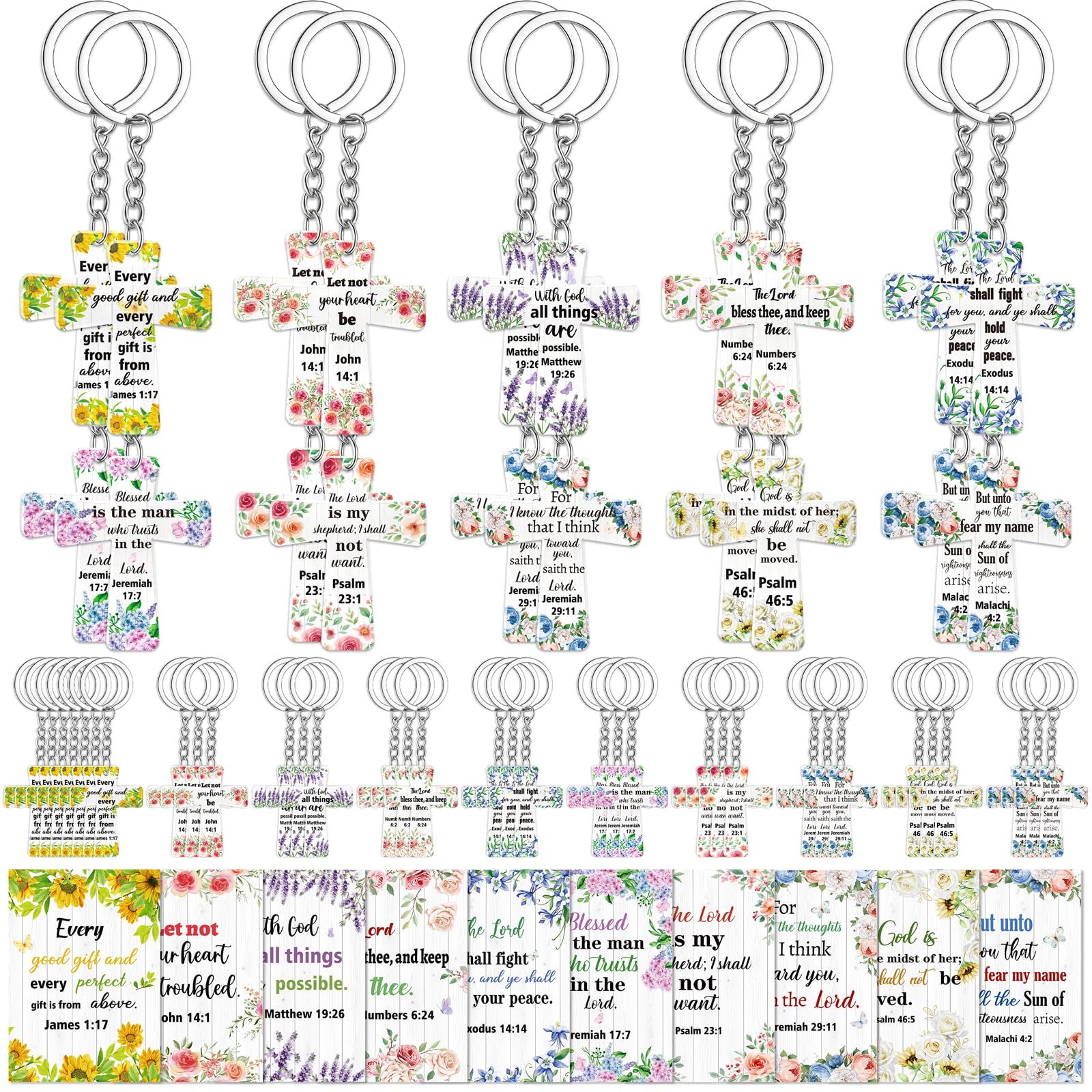 Comprehensive Gift Set for Christian Women: This bulk pack includes 55 acrylic keychains and 55 matching greeting cards, each offered in 10 coordinated designs. Great as meaningful Christian gifts for women, church event favors, or bulk Mothers Day gifts