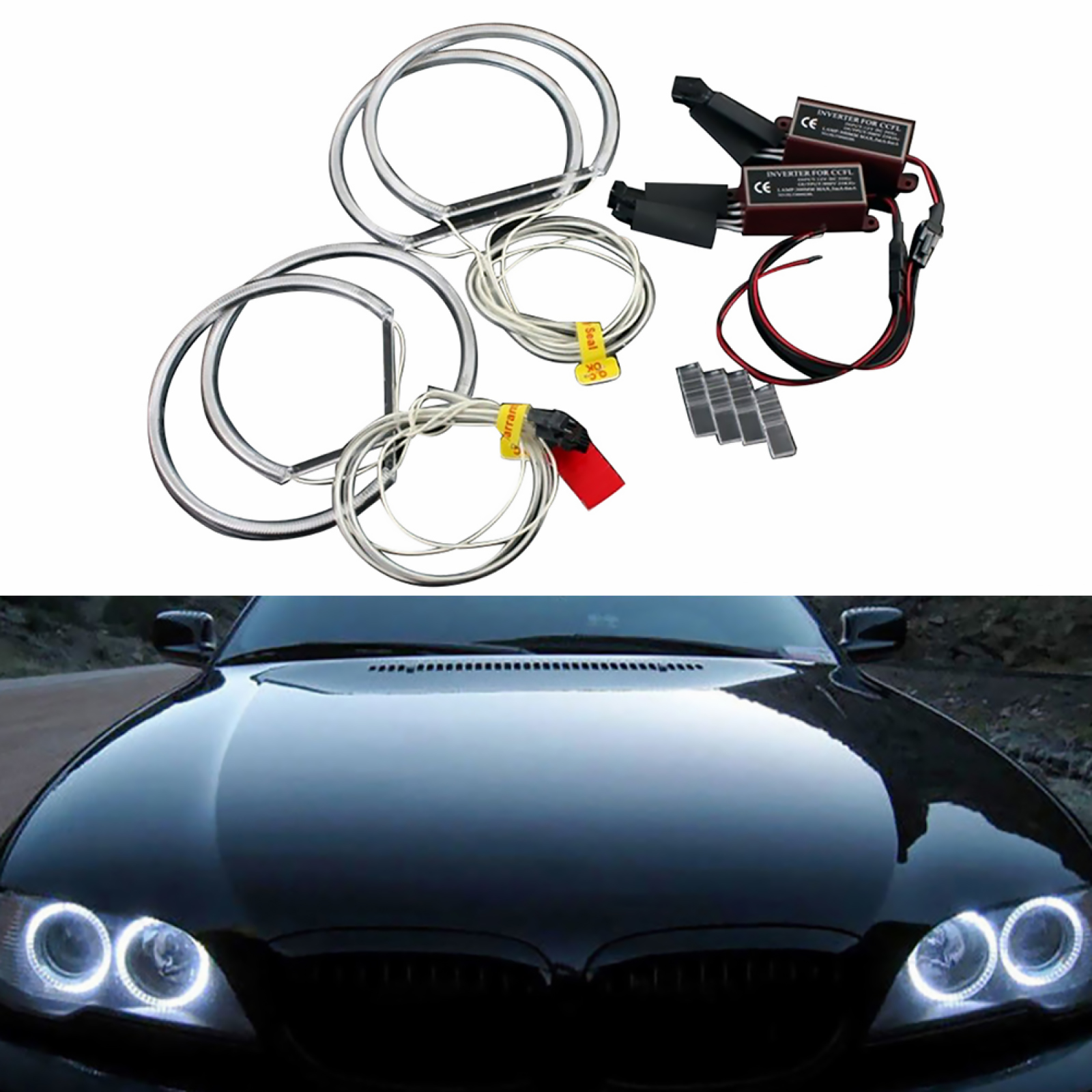 4 x 130mm Angel eye ring + 2 x Inverters + 4 x plastic clips + 2 x Wiring + 4 double-sided Adhesive pads