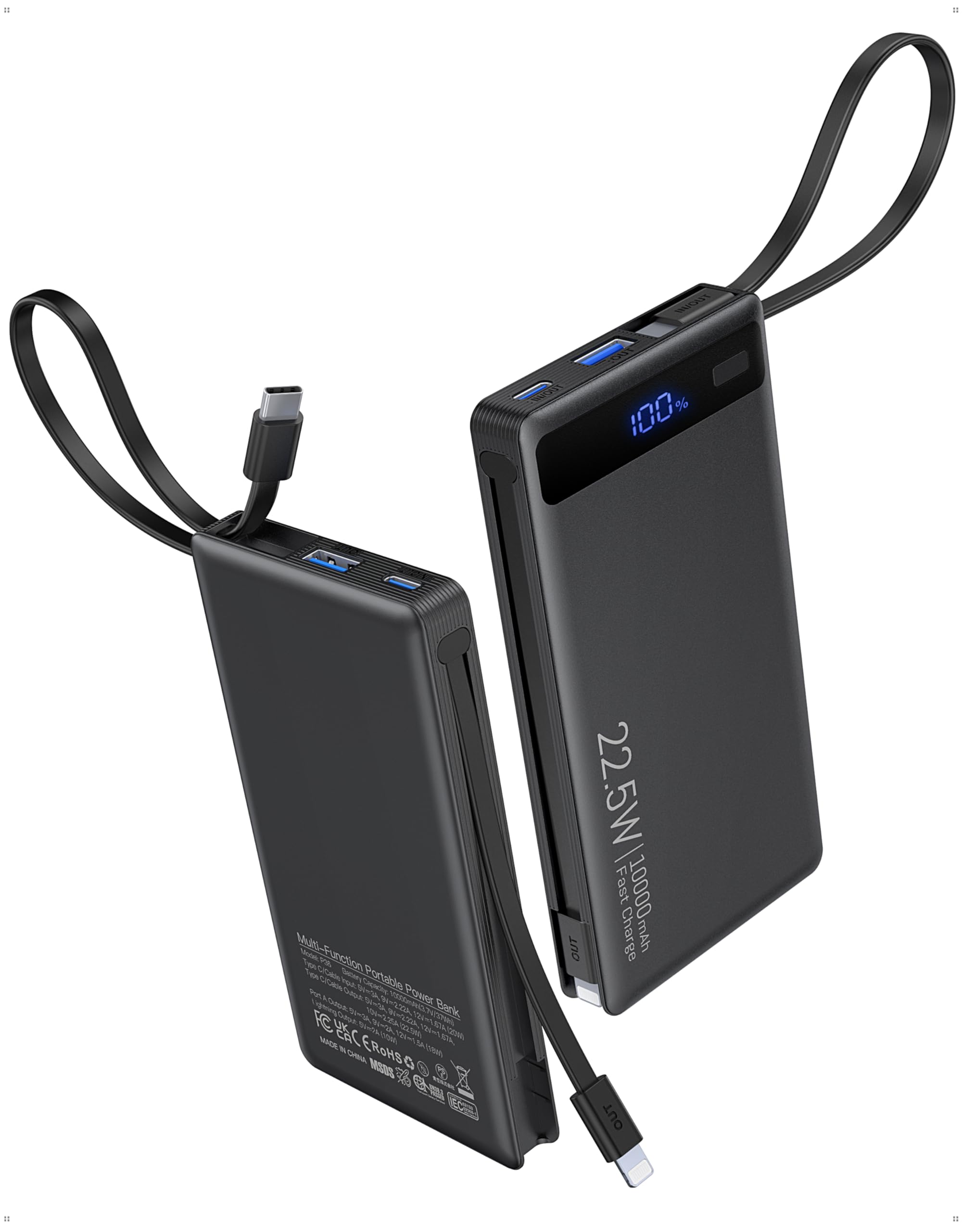 Power Bank with 2 Built-in Cables 10000mAh, 22.5W PD Slim Portable Black