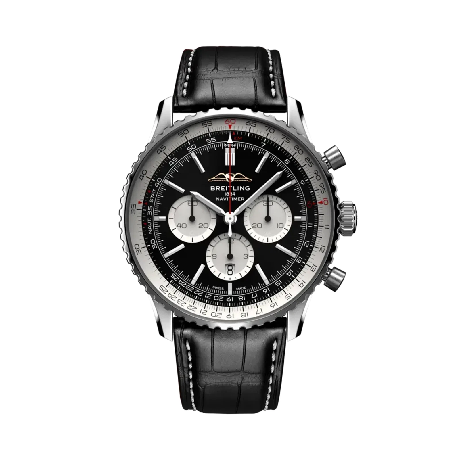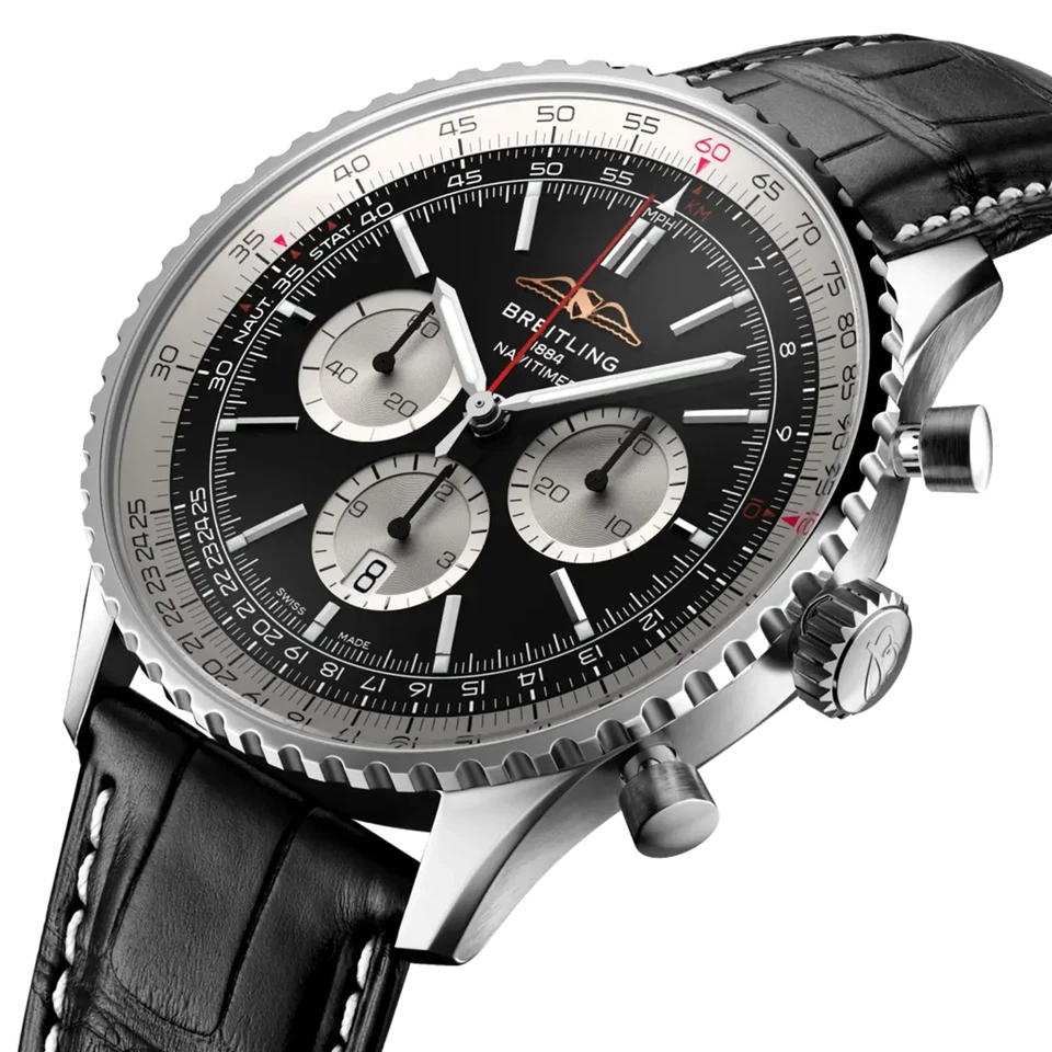 Paired with a black alligator leather strap, this version of the Navitimer feels more elegant and versatile, making it suitable not only for aviation enthusiasts but also for those seeking a sophisticated luxury chronograph for daily wear or formal occasions.