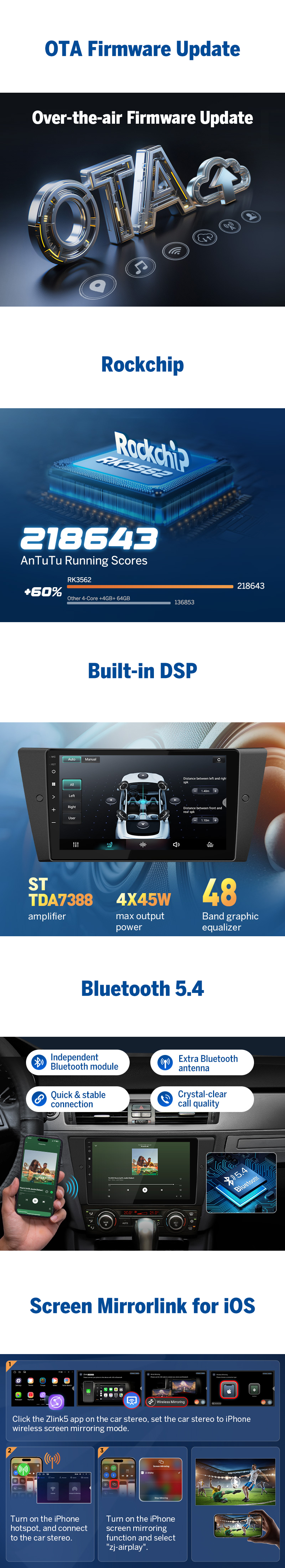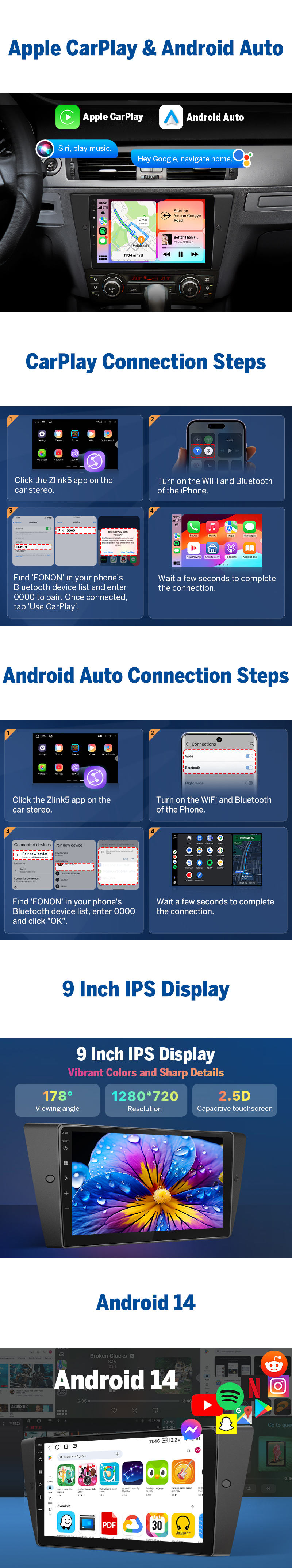 4GB RAM / 64GB ROM | Wireless CarPlay & Android Auto | 9" IPS HD Touchscreen | DSP Autoradio | GPS Navigation | WiFi 6 | Bluetooth 5.4 | CANBUS-Unterstützung
