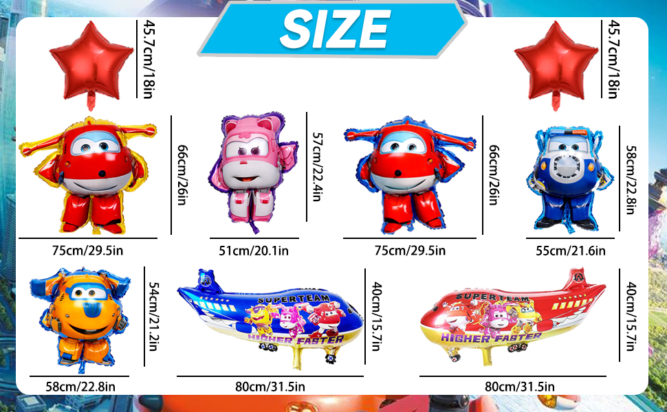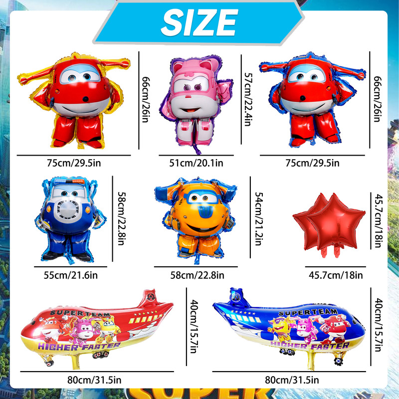Super Wings Foil Balloon Set: Our super wings birthday balloon set includes 7 super wings balloons, 2 super wings star balloons and other super wings birthday decorations. High Quality Materials: Our super wings party supply balloons are made of foil, with even, bright, and vibrant colors. You can use these super wings foil balloons to decorate your super wings themed birthday party and add color to your party. Easy to Inflate: You can easily inflate the super wings balloons with helium or air. After inflating, simply seal the balloons and place them wherever you like to make your super wings party even more eye-catching. Essential Super Wings Birthday Decorations: Super wings balloons complement your other party decorations perfectly. This exquisite super wings party balloon set will make your super wings birthday party special and unforgettable for your guests. Wide Range of Applications: Super wings birthday balloons are not only suitable for children's party decorations and super wings friend birthday party gifts, but you can also use them as perfect photo props, making them perfect for super wings parties and super wings themed birthday parties.