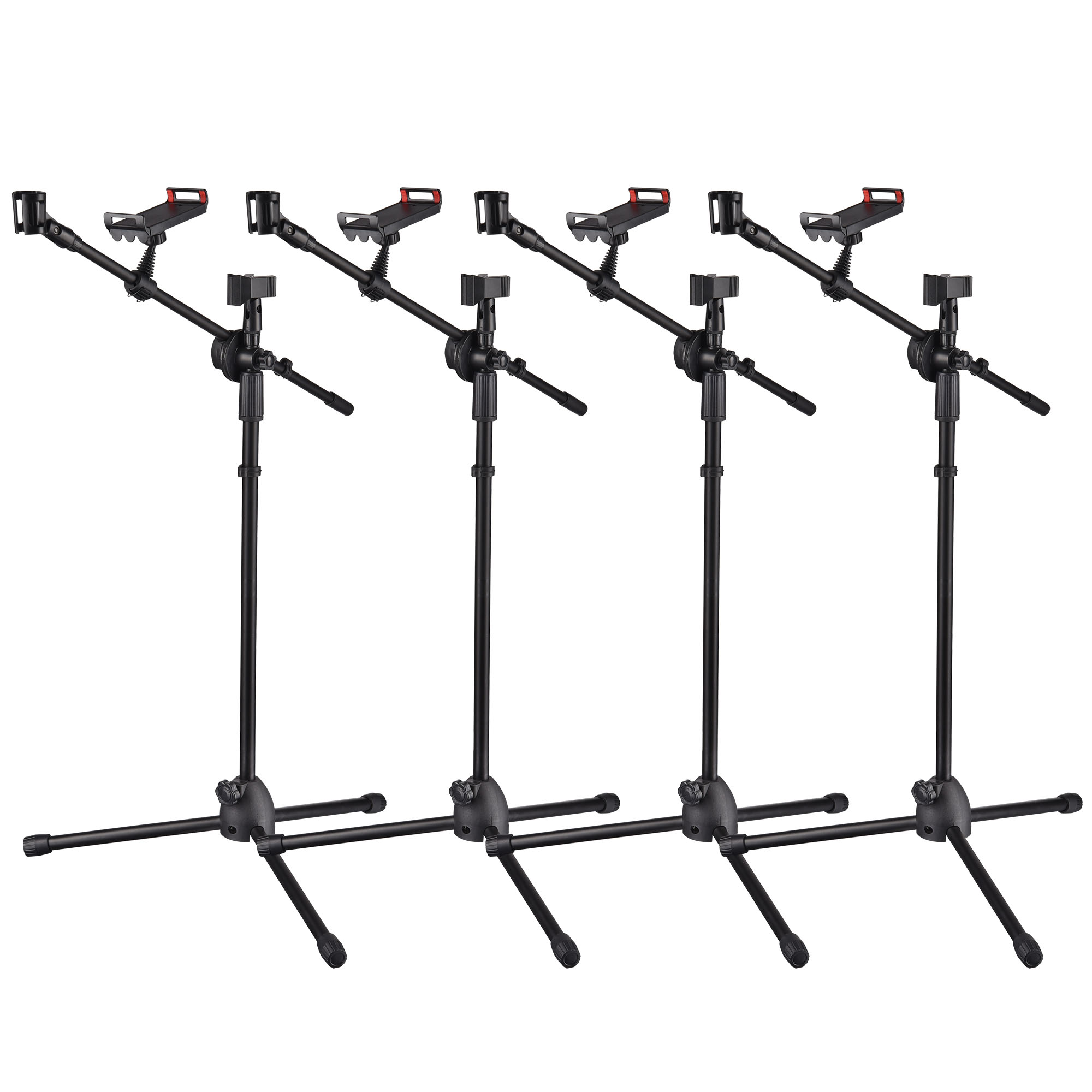 4 Packs of Floor-stand Design Microphone Tripod Stands feature 31" to 53" adjustable height and 360-degree rotatable boom arm for fitting different standing or sitting positions on stage or in studio. It comes with 8 mic clips for most handheld microphones and 4 phone holders for mounting phones with 4 7/16" to 7 5/16" width.