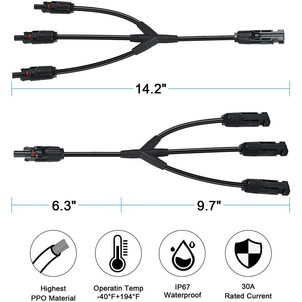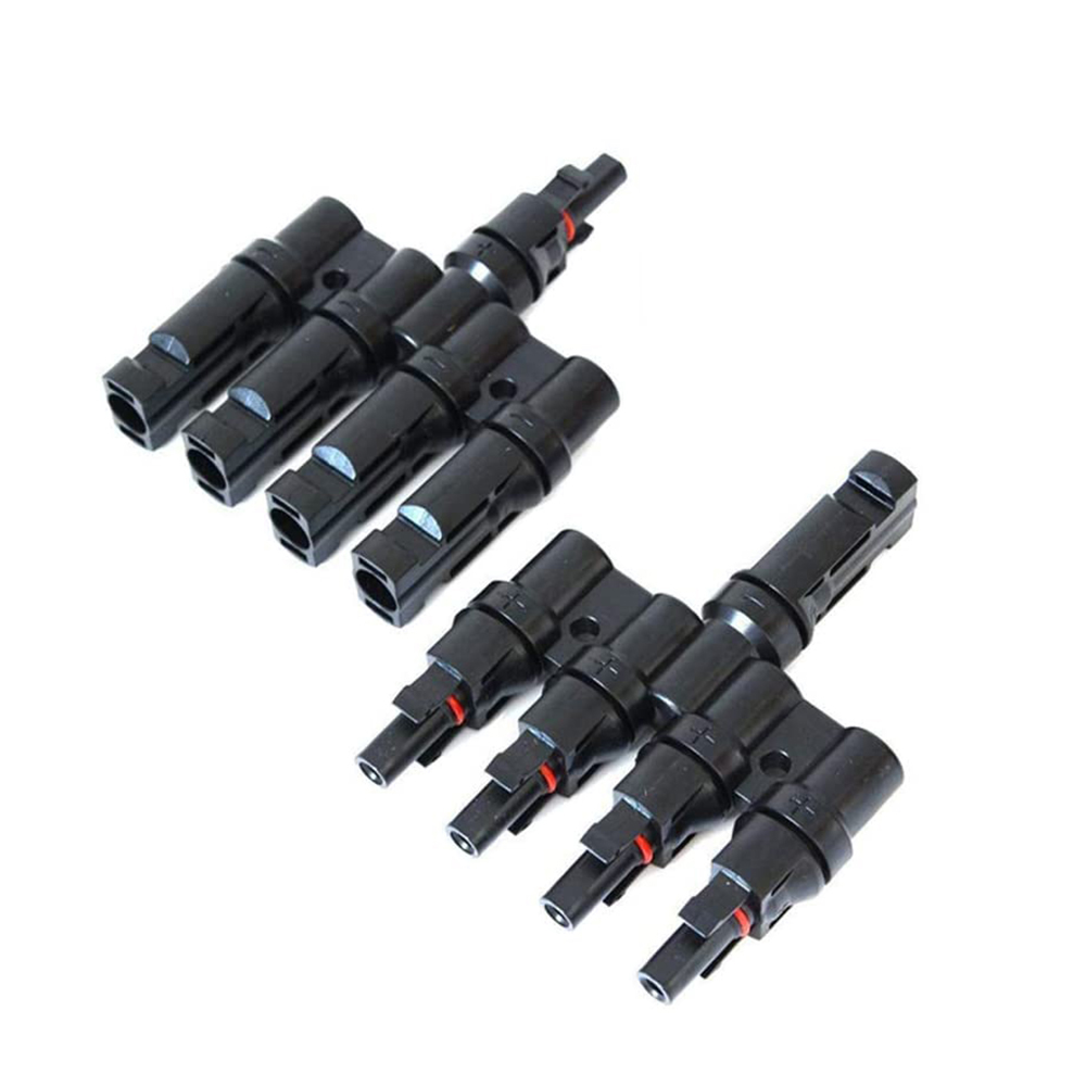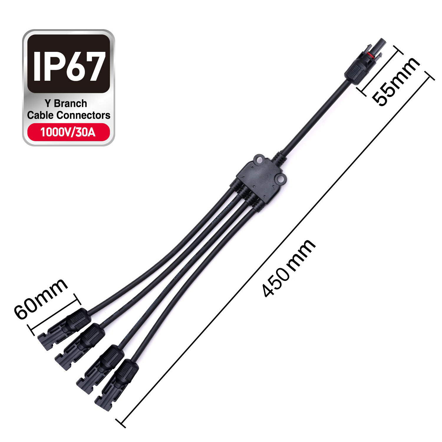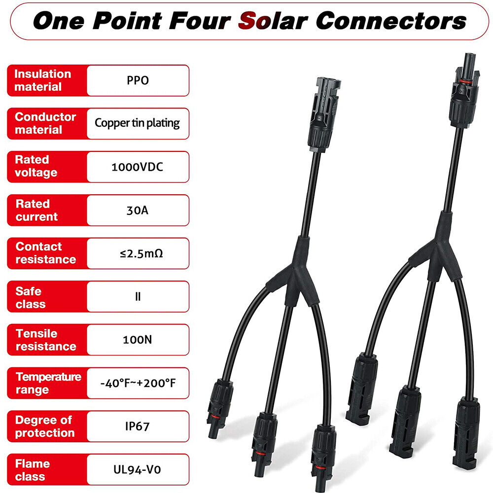Produktmerkmale: Parallele Y / T-Abzweigverbinder - 1 Stecker an 1/2/3/4 Buchse (M / FFFF) und 1 Buchse an 1/2/3/4 Stecker (F / MMMM). Doppelte Dichtringe für eine bessere Wasserdichtigkeit. Die Solarpanel-Steckverbinder sind mit PV-Kabeln mit unterschiedlichen Isolationsdurchmessern (10-14 AWG) kompatibel. Es kann in rauen Umgebungen wie Regen, starkem Wind und Schnee eingesetzt werden Hervorragende Alterungsbeständigkeit und UV-Beständigkeit. Versiegeltes und staubdichtes Design. Belastbarkeit mit großem Strom und hoher Spannung. Extra hohe und niedrige Temperatur und Feuerfestigkeit.