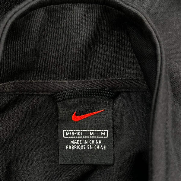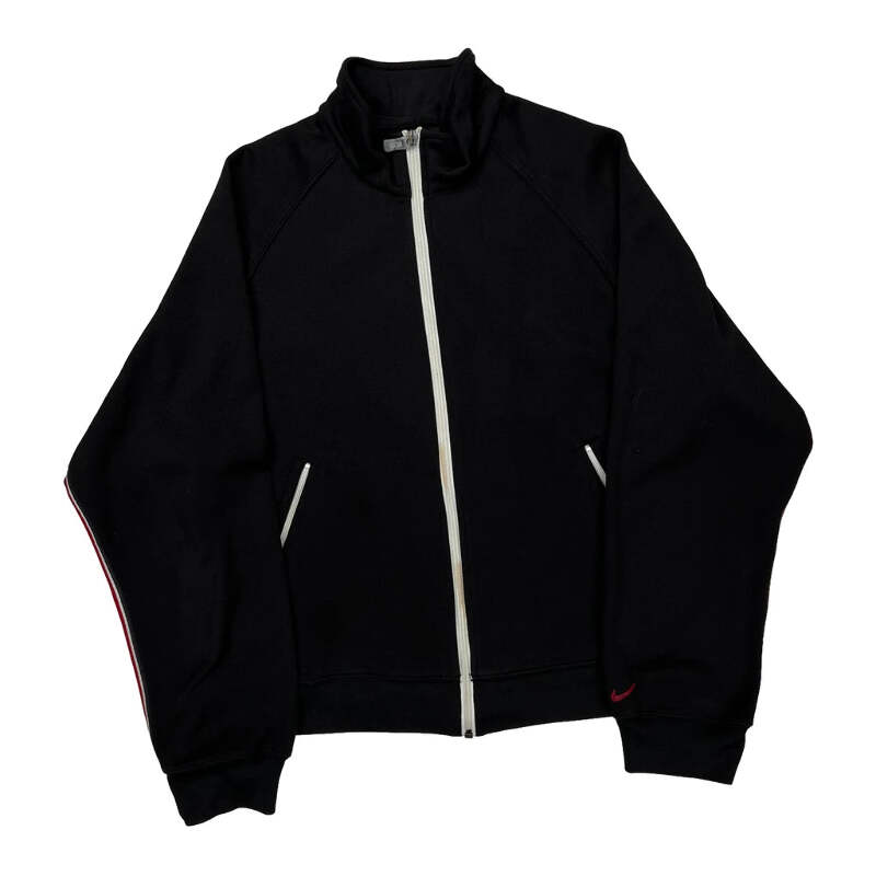 Black Track Jacket With White Zipper And Small Red Nike Logo On Sleeve.