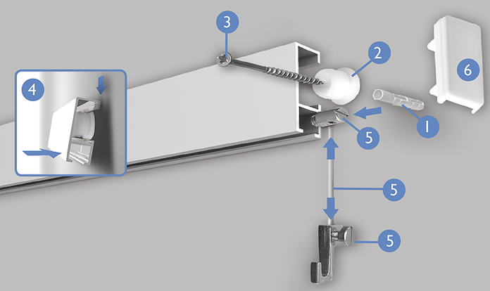 Die Befestigungsclipse werden in beliebiger Höhe an die Wand montiert. An den mitgelieferten Perlonseilen können die Bilder mit den Bilderhaken flexibel, elegant und sicher aufgehangen werden, ohne dabei die Wand zu beschädigen.