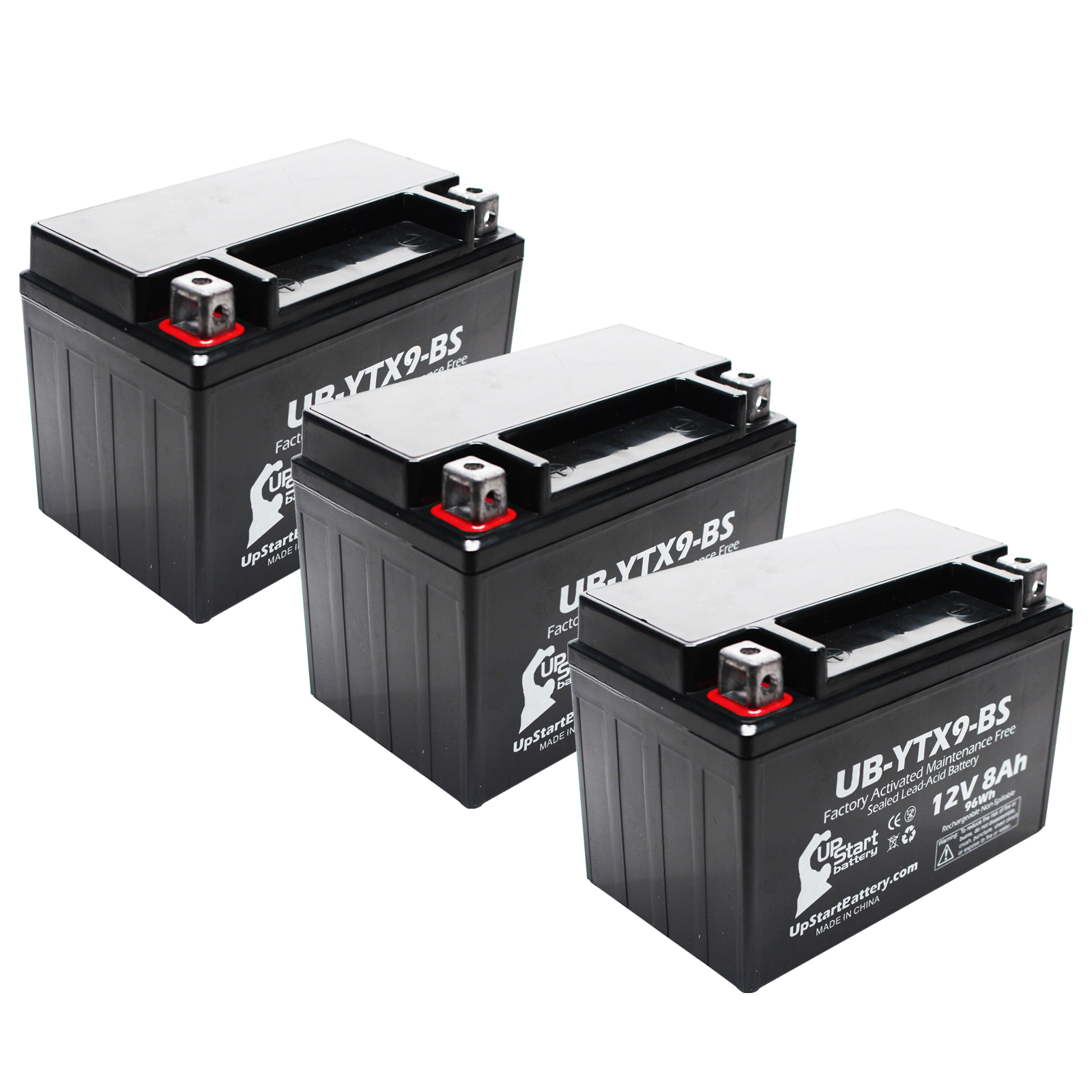 Genuine UpStart Battery replacement for 3-Pack UB-YTX9-BS Motorcycle Battery (12V, 8Ah). This 3-Pack UB-YTX9-BS Motorcycle Battery (12V, 8Ah) is compatible with the original.