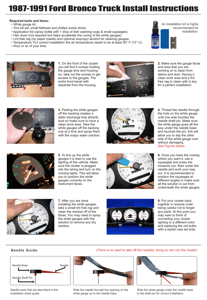 Our white gauges are an overlay style and install over your factory OEM gauges. They are manufactured this way to allow an easier installation without needle removal, re-wiring or without voiding your vehicle warranty. Application of the white gauges is comparable to the process of tinting windows, we highly recommend our gauge face installation kit for an error free install.