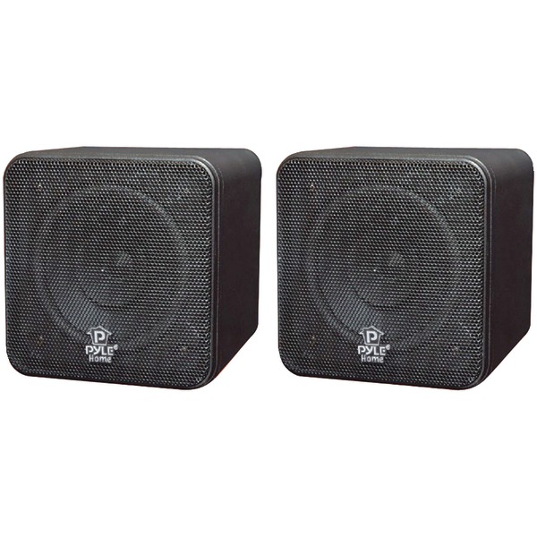 These black full range mini cube bookshelf speakers may look cute, but they pack a big punch. They�re great for home theater systems or stereos, and they look sharp on tables or bookshelves. These speakers are powered by 4� paper cone drivers pushing 200 watts, delivering a frequency response of 80 Hz to 18 kHz. They�re also video shielded to prevent damage to CRT monitors. When you�re looking for power in a small package, look to these bookshelf speakers from Pyle Pro.