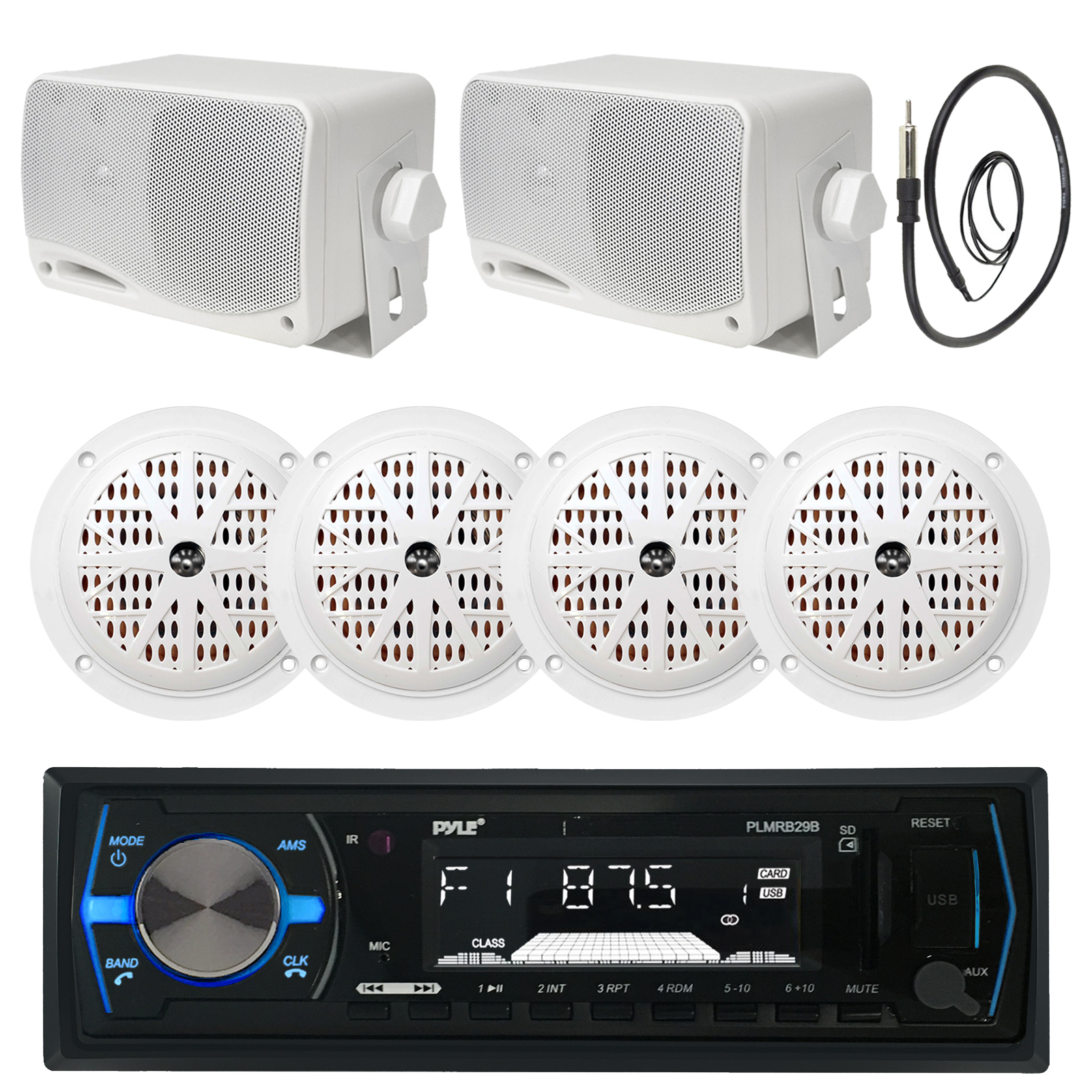 Pyle PLMRB29B Bluetooth In-Dash Stereo Radio Headunit Receiver, Wireless Music Streaming, Hands-Free Call Answering, MP3 Playback, USB/SD Card Readers, Aux (3.5mm) Input, Remote Control, Single DIN, Pair PLMR61W Pyle 120 Watts 6.5'' Dual Cone Marine Speak