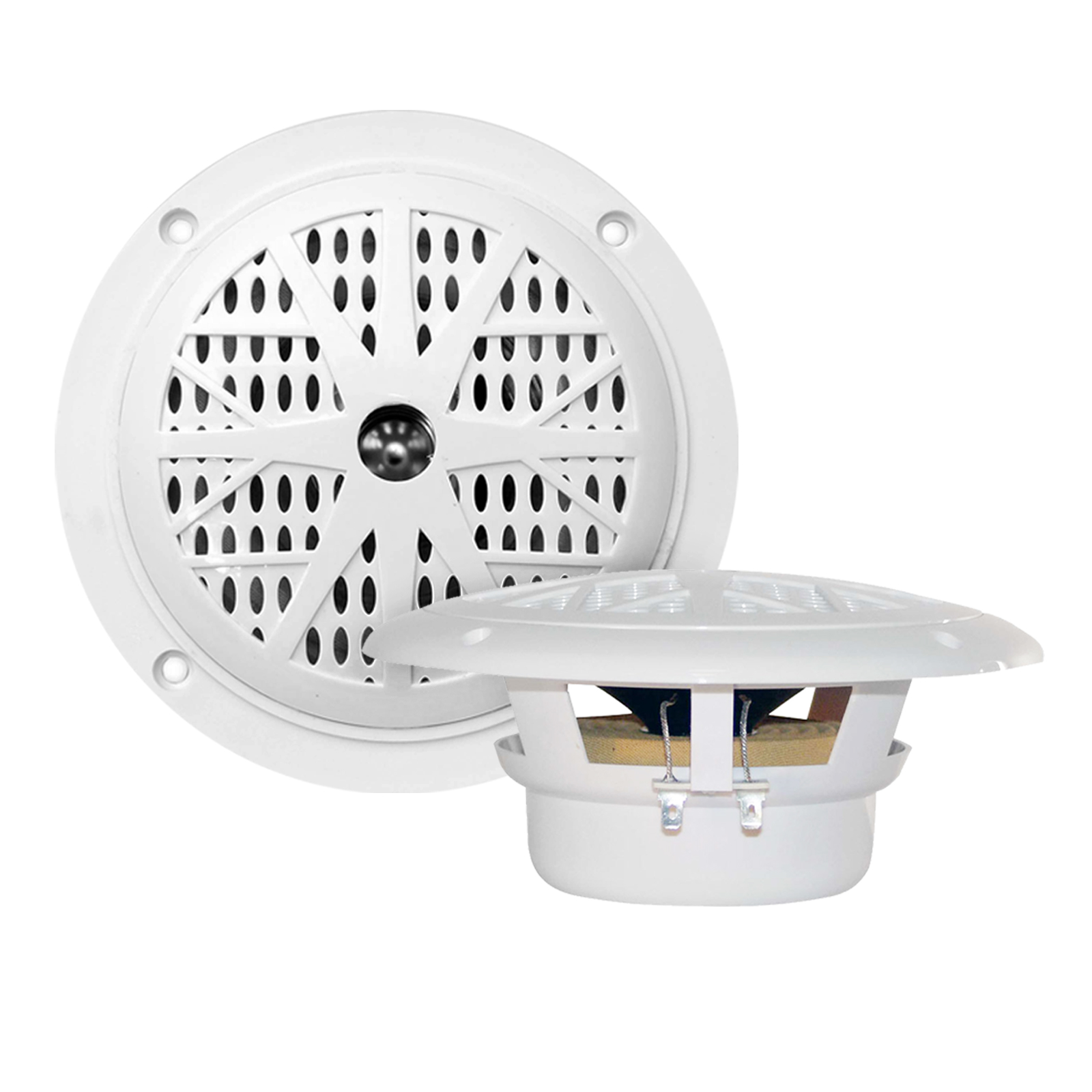 Pyle's Hydra series speakers are waterproof and designed for use in your boat, on the dock, by the pool, or simply mounted outside. They're designed with rust-proof mesh covers for quality protection. The PLMR61W is a pair of 120-watt, 6.5' two-way, full-range speaker suitable for marine use. These white speakers are equipped with a polypropylene cone with cloth surround and 1' aluminum voice coil for accurate sound reproduction. The molded ABS plastic basket keeps your sound distortion-free. Package includes mounting hardware and wires.
