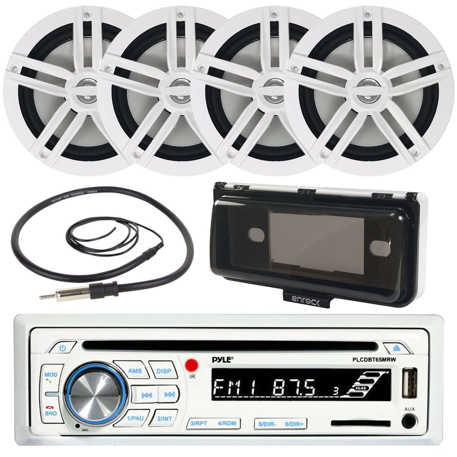 Pyle Single DIN AM/FM Radio Stereo AUX CD Player Bluetooth Receiver, 4x Enrock EM265W 6.5" 2-Way Marine White Speakers, Enrock Marine 22" Antenna, Enrock Radio Shield