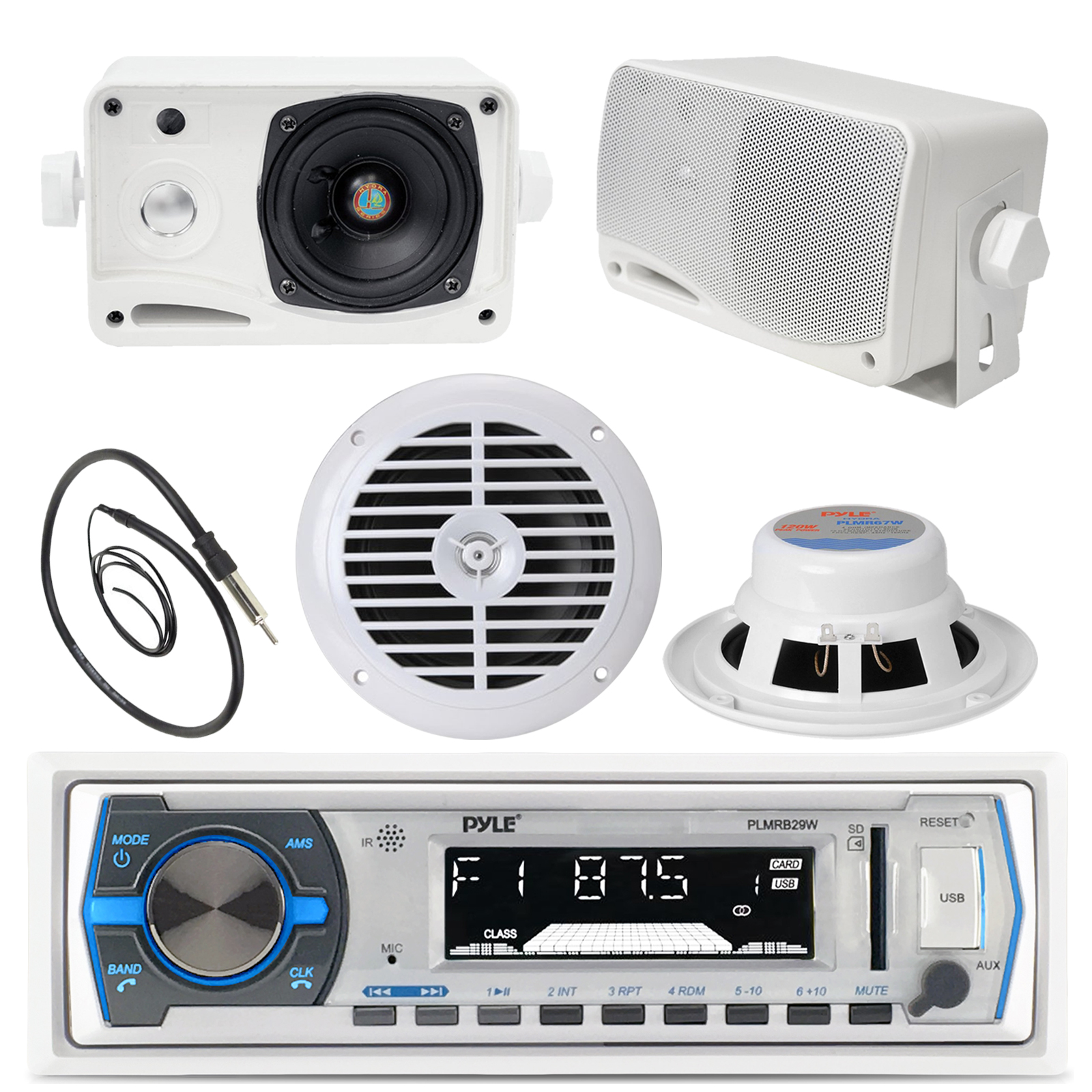 Pyle PLMRB29W Bluetooth In-Dash Stereo Radio Headunit Receiver, Wireless Music Streaming, Hands-Free Call Answering, MP3 Playback, USB/SD Card Readers, Aux (3.5mm) Input, Remote Control, Single DIN, Pair PLMR24S Pyle 3.5'' 200 Watt 3-Way Weather Proof Min